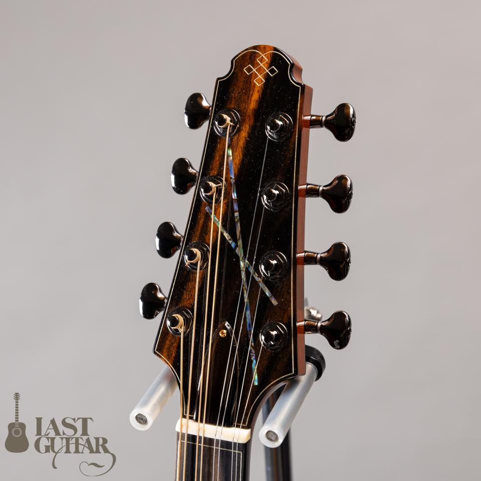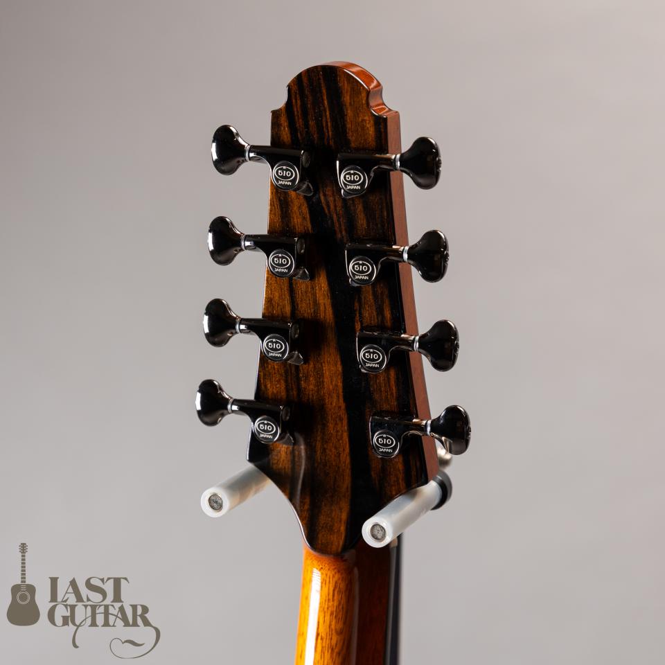 ヘッドのライティングインレイ、エボニーサークルに伊豆産アワビを使用したコンパスインレイが入ったサウンドホールロゼッタ、ボディトップセンター下部のケルティックノットインレイ、アイリッシュブズーキらしいバインディングのカラーラインなど、櫻井氏のギターのデザインと掛け合わせたルックスは、すごくマッチしていて、素敵です。ヘッドプレートのエキゾチックエボニーも雰囲気ありますね。