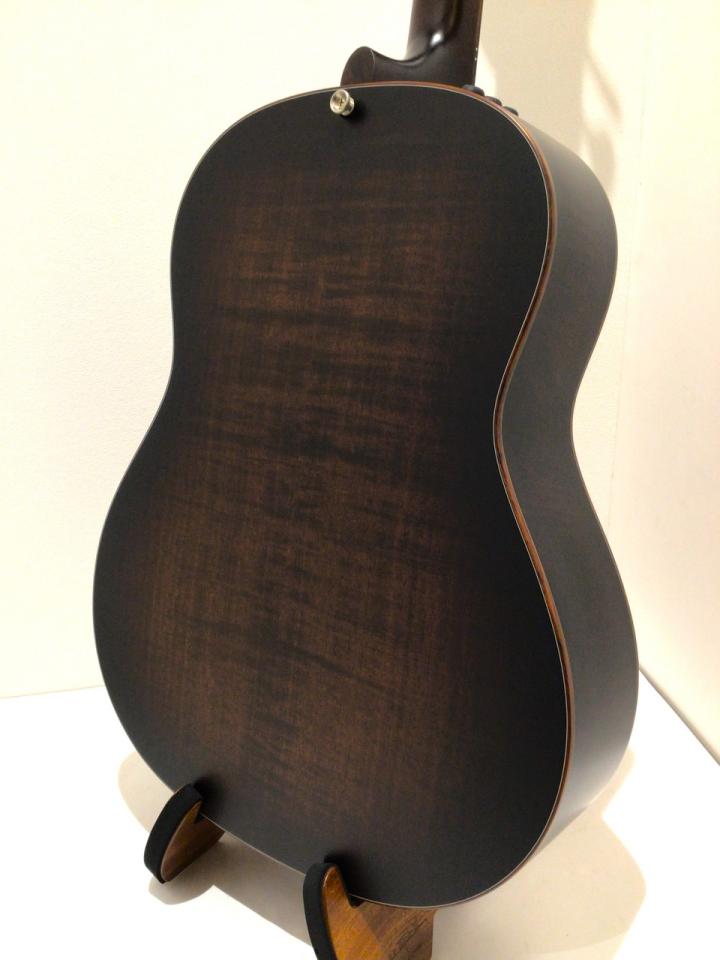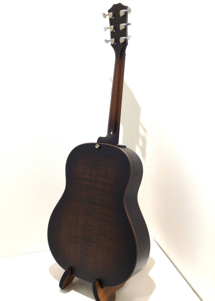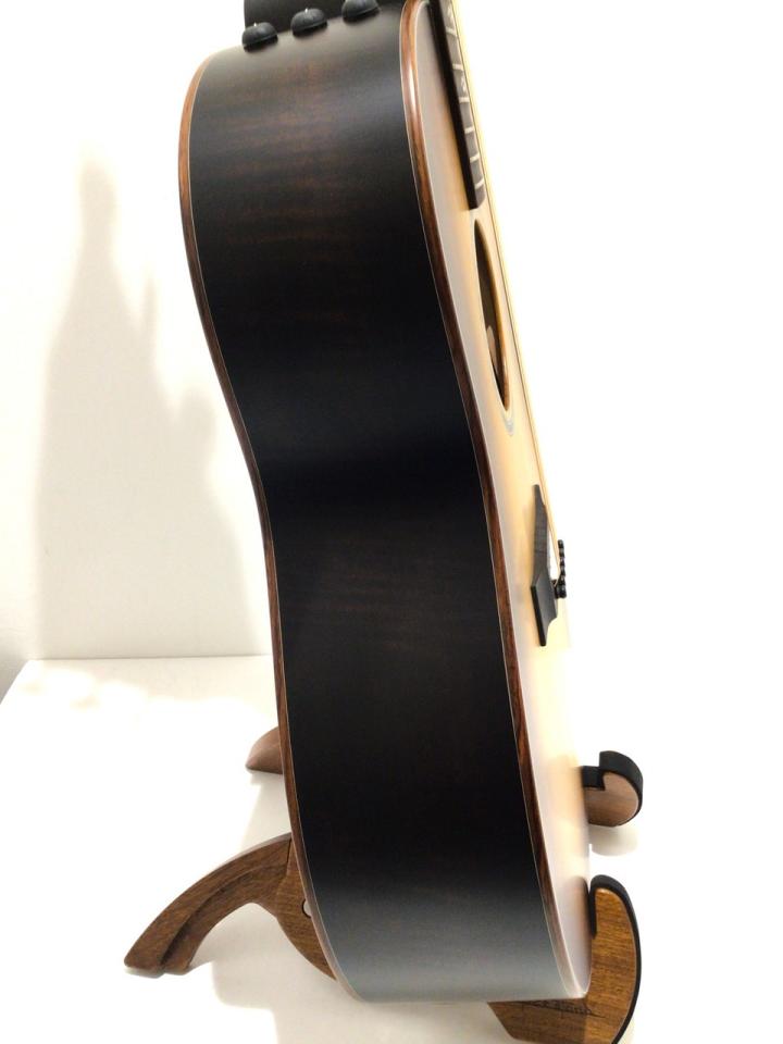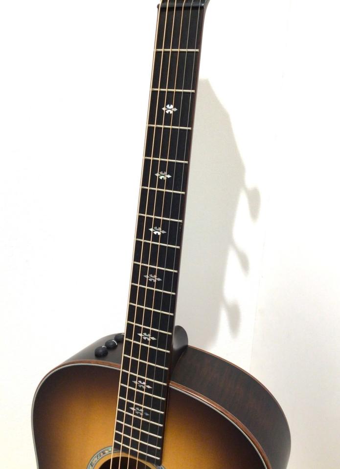 バーストがかったブラウンカラーに、サウンドホールを縁取るアヴァロン、カスタムならではのフィギュアドの杢目をセレクト。