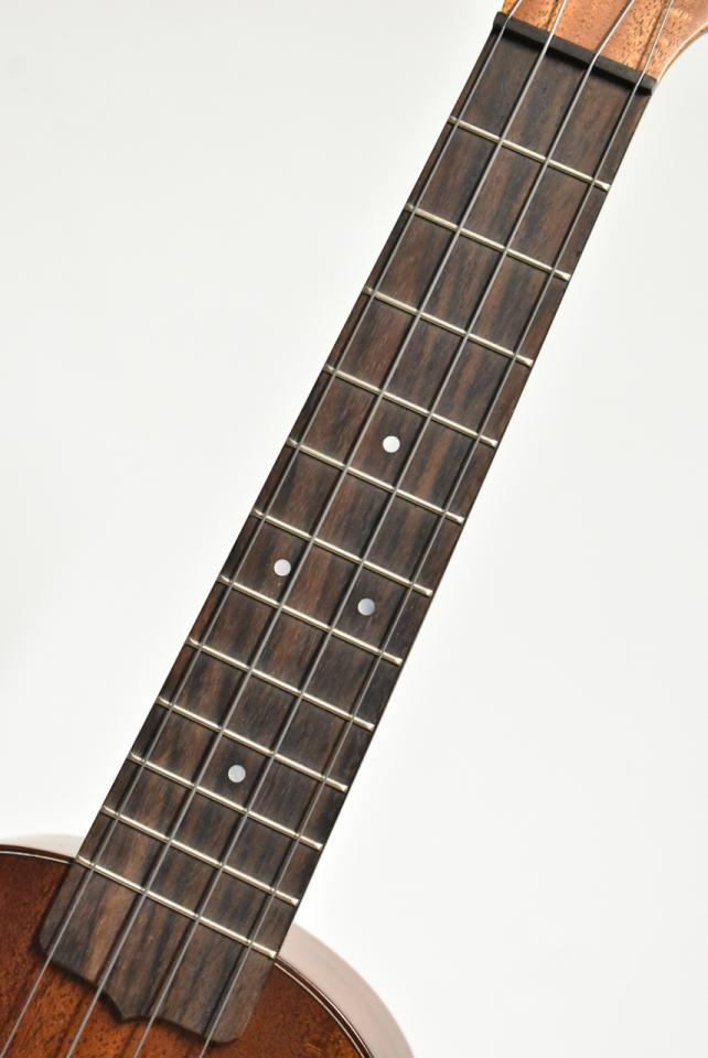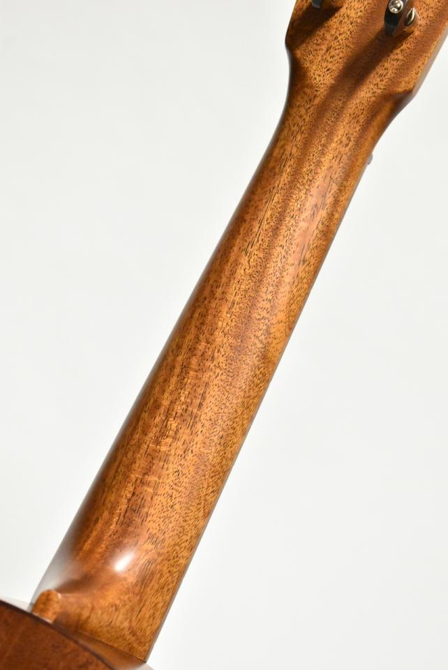 本来ウクレレの多くは表板と裏板は「ブックマッチ」(1枚板を半分にして真ん中でくっつける)の構成ですが、こちらは1枚板をそのまま1ピースで使用しております。