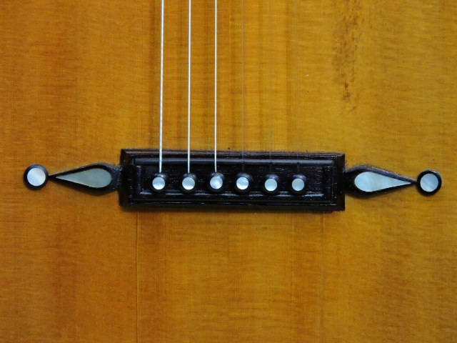 ブリッジはパノルモの場合 通常は弦高調整が出来ないのですがこのパノルモにはモダンギターのサドルに当たる部分に後世の修理者が独特の工夫を凝らしていて弦高調整が出来るようになっています。