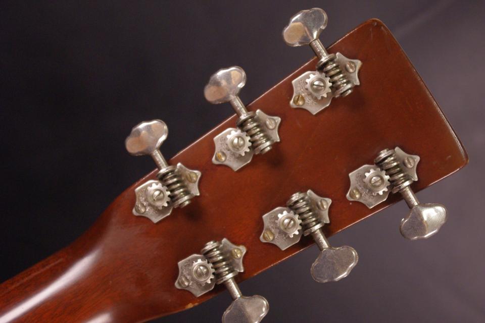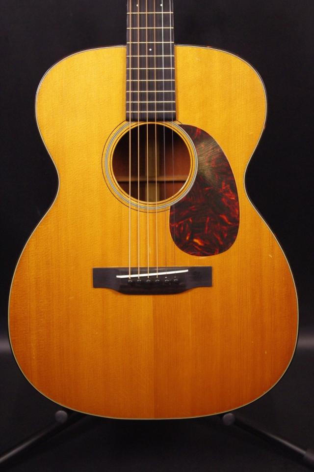 貴重なマーティン000-18が入荷しました!シリアルナンバーから1934年に生産されたモデルですがトップを交換し再度組み上げあげた1本でお安くしています!トップはシトカスプルースが有力、サイドバックにはマホガニー、指板はエボニー、ブリッジはロングサドル仕様のエボニーで上手く交換、全体的にリフィニッシュされしっかりとメンテナンスされていますので演奏性、サウンドは素晴らしいです!再塗装のためヘッド裏の刻印は薄くなっています。バックバインディングはブラックでオリジナルですがトップバインディングはべっ甲柄、ピックガードも交換されています。バックはくびれ付近にクラックがありましたが演奏上支障ございません。ネックヒールへはストラップピンが打っており現在は外しているため穴が確認できます。貼付けタイプのピックアップが搭載されておりライブでもお楽しみいただけます。ナット幅は約44mmのやや太めのしっかりとした30年代グリップです!ネックはリセット調整されていますのでアングルも理想的です!フレットも交換済みで高さがあり長期安心いただけます。弦高は12フレット6弦側で約2.3mm、1弦側で約1.4mmの高さでハイポジションまで押さえやすく調整しています。ブリッジの高さも理想でサドル残も確保していますので将来の微調整も安心です。30年代ネックとトップもスキャロプドXブレーシングを採用していますので戦前らしく低中域が気持ちよく膨らみます!スロトークも纏まり迫力がありますし指で弾いてもバランスがよく温かみがあり非常に癒されます!マーティンハードケース付!