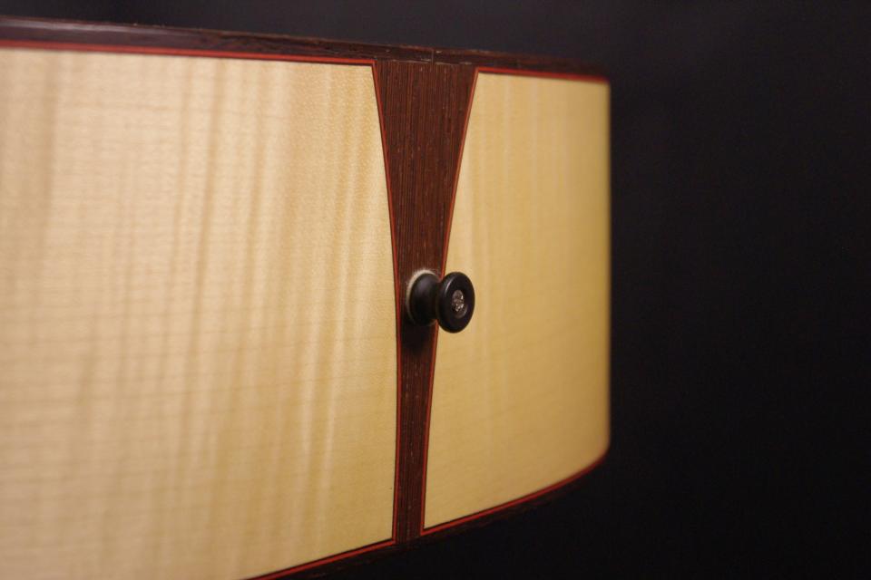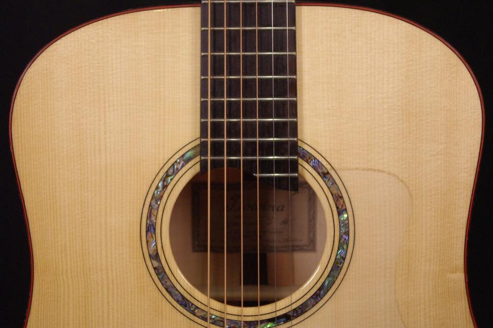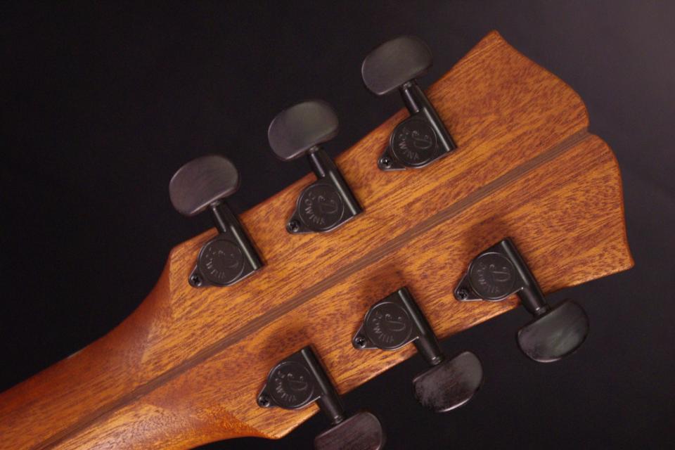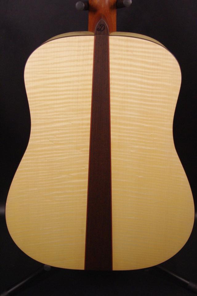 トップ ドロミテ・スプルース、サイドバック フレイム・メイプル、指板・ブリッジ エボニー、ネック マホガニー、オリジナルペグ、オリジナルピックガード、アバロンサウンドホールリング、Xブレーシング、ウッドバインディング、