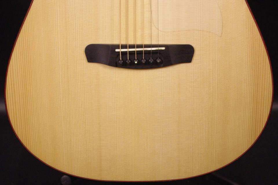 スロバキアに工房を構えるDowina(ドウィナ)のドレッドノートタイプ D ds が入荷しました!!トップにはドロミテ地方で産出されたドロミテ・スプルース、サイドバックには木目の美しいフレイムメイプルの厳選された材を採用しています。2019年頃生産が有力で使用感はありますが全体的に綺麗に残っています。トップはグロスフィニッシュ、サイドバックはサテンフィニッシュで薄く仕上げています。ペグやピックガード、ブリッジなどパーツもオリジナルで残っています。ヘッドにはガーネットのインレイ、サウンドホールにはアバロンインレイが施されています。ネックヒールへのストラップピン加工、またピックアップの取り付け加工もございません。ナット幅は約44mmありますがやや薄めの握りやすいグリップで幅広い演奏でお使いいただけます。ネックのアングルは14フレット付近から元起きが見られますが音詰まりもなく問題なくお使いいただけます。トラスロッドの動作にも余裕があります。フレットの減りも少なめで今後も長期でお使いいただけます。弦高は12フレット6弦側で約2.5mm、1弦側で約1.7mmの高さで押さえやすく調整してます。サドル側での微調整にも対応できます。メイプルですが硬すぎない豊かなサウンド!オール単板で重量も軽くボディ全体でよく響きます!是非この機会にお試しください!オリジナルハードケース付。