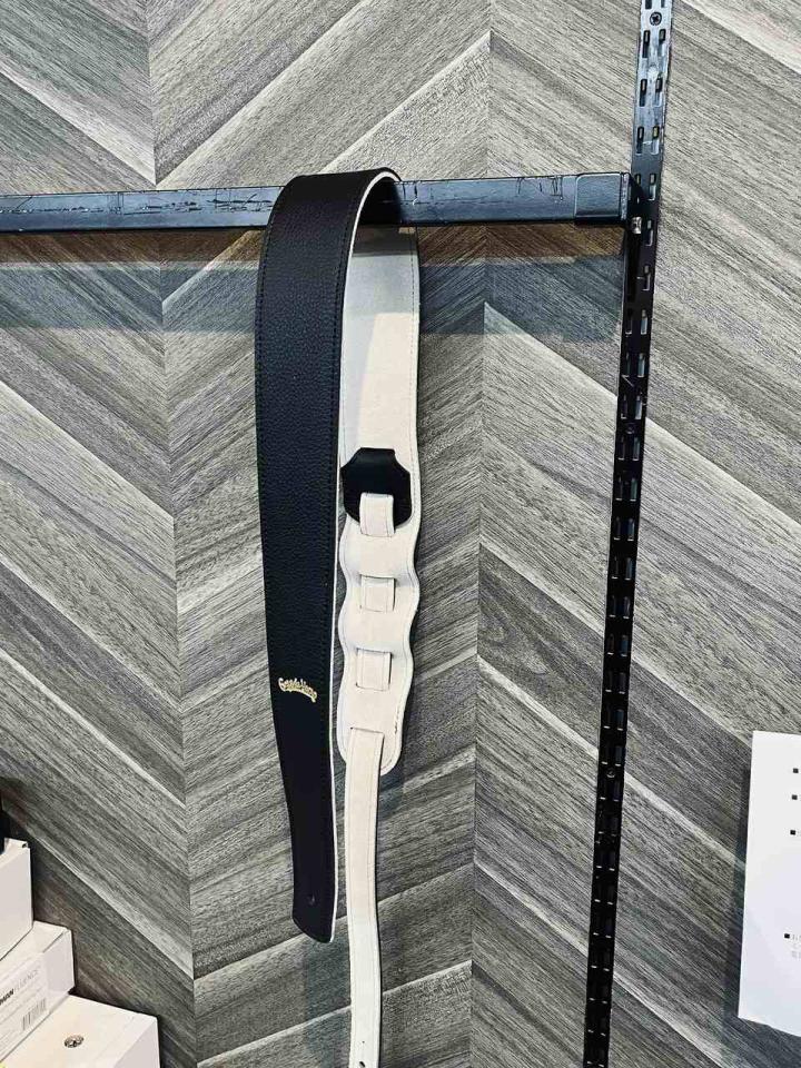 肩口の幅が5.5cmギター接続部(剣先)が38mmと非常にスタイリッシュなギターストラップとなります。表にしっとりモチモチの牛革、裏には鮮やかな発色のイタリアンスエード(牛革)を使用しております。