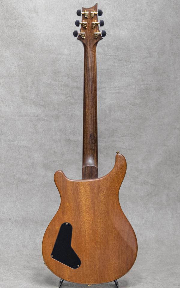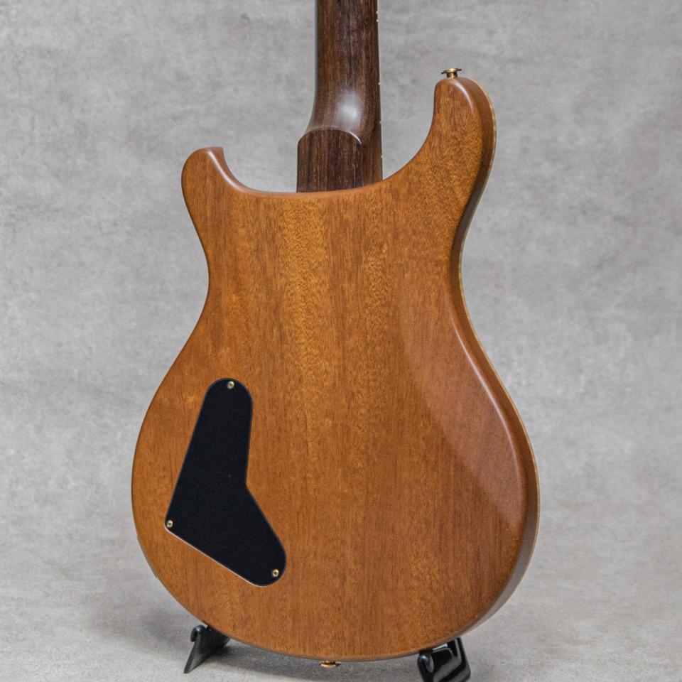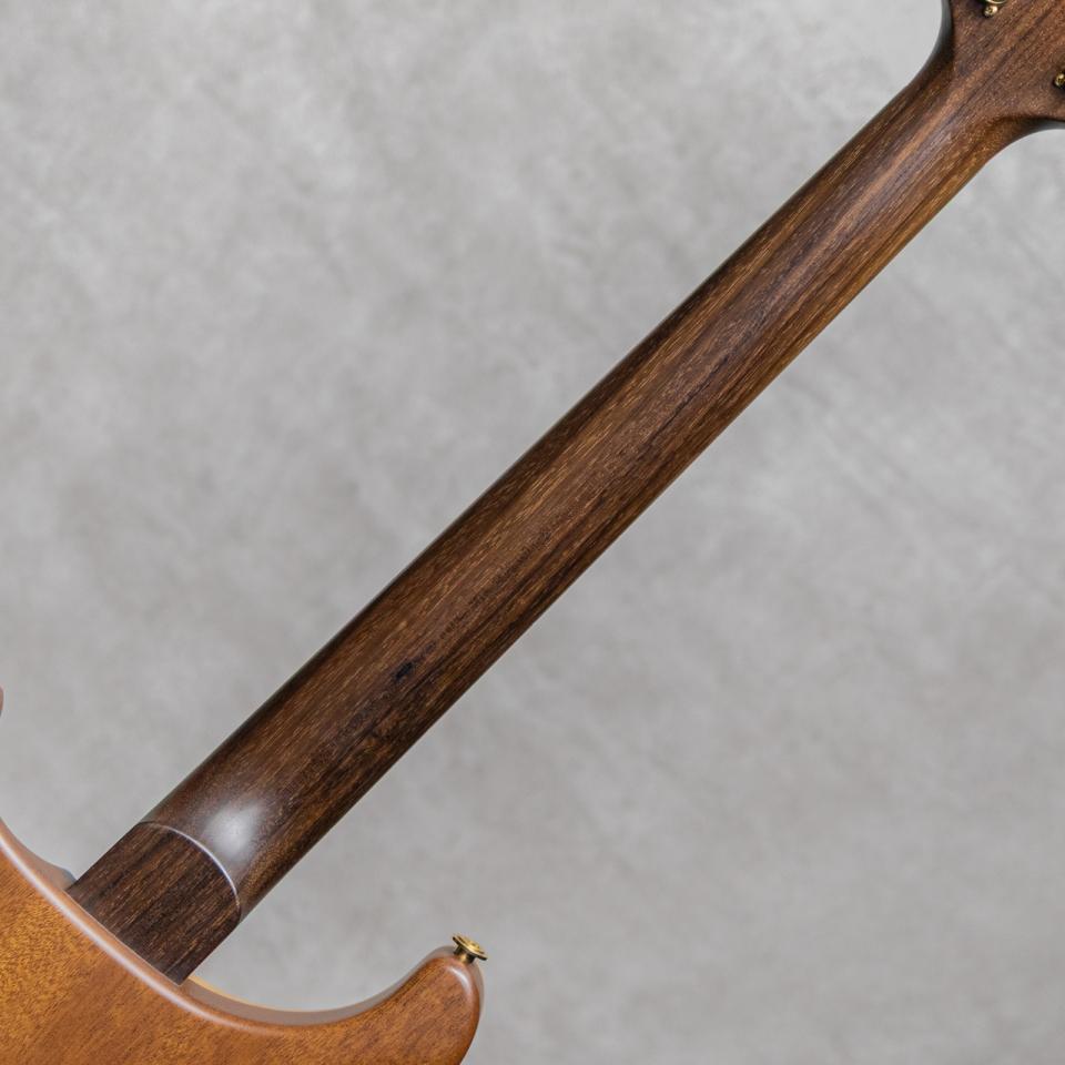 PRS最高峰に位置する"Modern Eagle"は2004年に初代モデルが登場、その後も最新のスペックを採用しながら後継モデルが生産され続けています。その中でもブラジリアンローズウッドを惜しげもなくネック、指板に採用した初代"Modern Eagle I"は現在でも多くの憧れを集めてやみません。本器は2017年製"Modern Eagle I Reissue"、お馴染みの退色もアイコニックな"Faded Blue Jean"カラー。初代"Modern Eagle I"と同スペックにて、日本のみで発売がされた限定復刻の1本。メイプルトップ/マホガニーバックボディ、Phase II ”Grommet Style” Locking Tuner、オールドスクールバードインレイ、ラップアラウンドスタイルブリッジ、象徴的でもあるニトロセルロースラッカーのサテンフィニッシュ。ピックアップに関しても初代と同じModern Eagle RP("Ralph Perrucci") Treble/Bassを復刻。クリアかつレンジの広い透き通るトーン、一般的なローズネックモデルに比べ、ギター然としたミッドの抜け感、引き締まった解像度が一層際立つブラジリアンローズネックならではのキャラクター。ボリュームやトーンを少し絞った甘いトーンでも、しっかりとした音像の立体感を失いません。こちら目立ったダメージなどなく綺麗なコンディションを保った美品中古品。フレットの減りも見受けられず、ロッドの調整を含めネックのコンディションも良好。弾きやすいセッティングができております。多少のハードウェアのくすみ、ボディバックの多少の擦れ跡、弾き跡程度はあり、見慣れたカラーの退色もございますが、サテンフィニッシュのマットな質感も目立って艶が出てしまったりなどはなく、丁寧に扱われていたことが判ります。高い人気を誇る初代”ME”の限定復刻、ぜひお見逃しなく。オリジナルハードケースが付属。