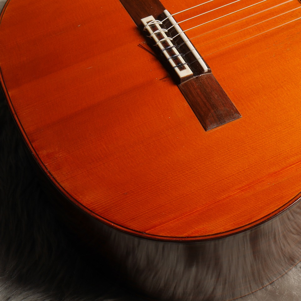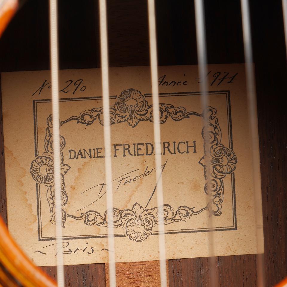 本ギターは、フランスを代表するギター製作家、ダニエル・フレドリッシュ(Daniel Friederich)氏による1971年製の一本です。幼少期より祖父の家具製作工房で木工技術を磨き、22歳でイダ・プレスティの演奏に触れ、ギター製作の道へ。その道のりは、ロベール・ブーシェやプレスティとラゴヤといった巨匠たちの助言を受けながら、本格化しました。