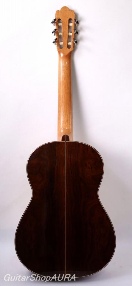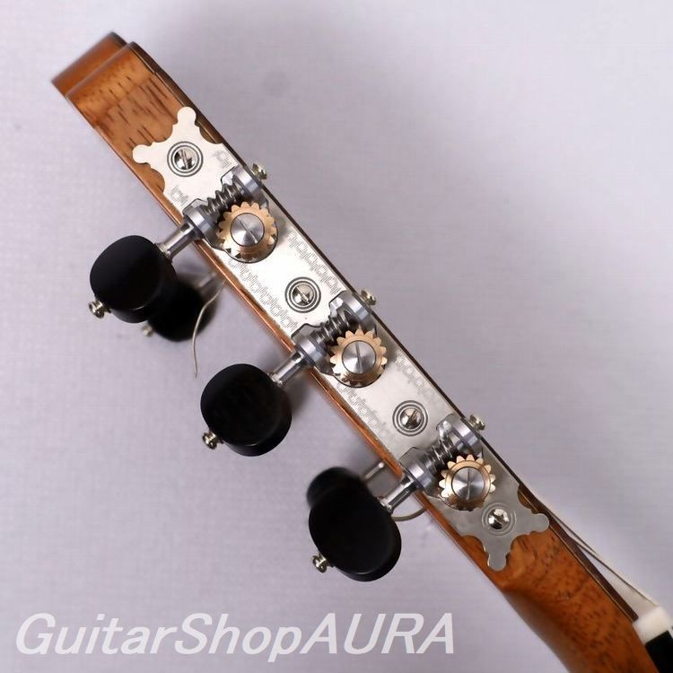 表面板の松材はさりげなく杢の入った迫力のあるもので、横裏板のこれも繊細な野趣を感じさせるマダガスカル・ローズウッドとの対照が印象的。意匠においてもロゼッタは黒を基調とした大変に迫力のあるもので、その細工の緻密さに目を奪われます。ヘッドシェイプはトーレス~ガルシアのスタイルを踏襲しており、そのどこか古風な佇まいが魅力的。弦長は640mm、ネック形状はDシェイプの丸みのあるスタイルでコンパクトなグリップ感となっています。弦高値は3.0/4.0mm(1弦/6弦 12フレット サドル余剰1.0~1.5mm)、弦の張りはやや強めとなっています。糸巻はイタリアの高級ブランドAlessi のガルシア・エスペシャルモデルを装着しています。全体は美しいセラック塗装仕上げ。