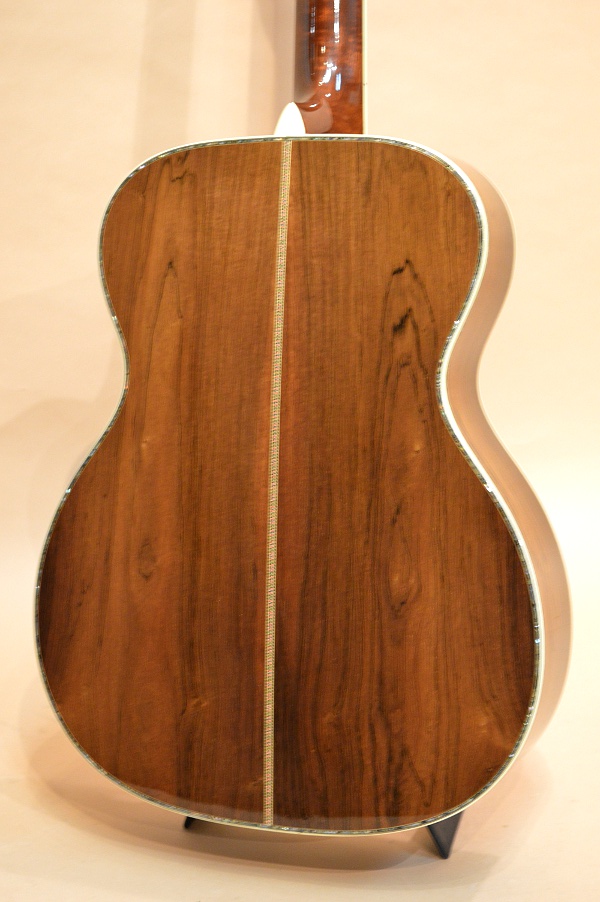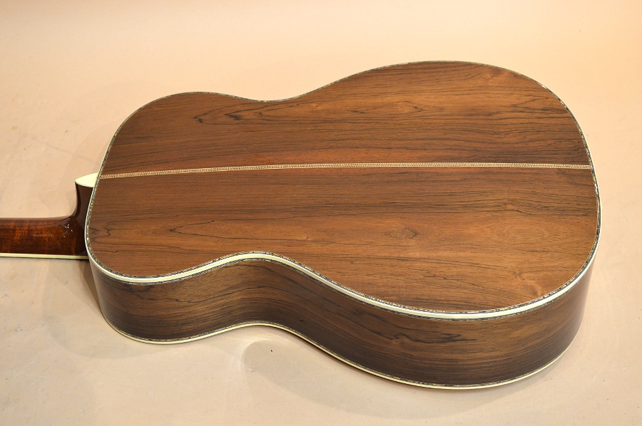アディロンダック・スプルースTOP、ブラジリアン・ローズウッド(ハカランダ)SIDE&BACK、マホガニーNECK、エボニー指板&ブリッジ、プリ・ウォー・スタイル・スキャロップ・ブレーシング、実測45.3mmナット、25.4インチ・スケールのオーケストラ・モデル。バーティカル・ロゴに45スタイル・スノウフレイクス・ポジション・マーク、45スタイルのアバロン・トリム&ロゼッタが燦然と輝く存在感バツグンの出で立ち!SIDE&BACKに使われているハカランダは半柾半板の杢目ですが、如何にもハカランダらしい黒い筋の入った良材が使用されています。