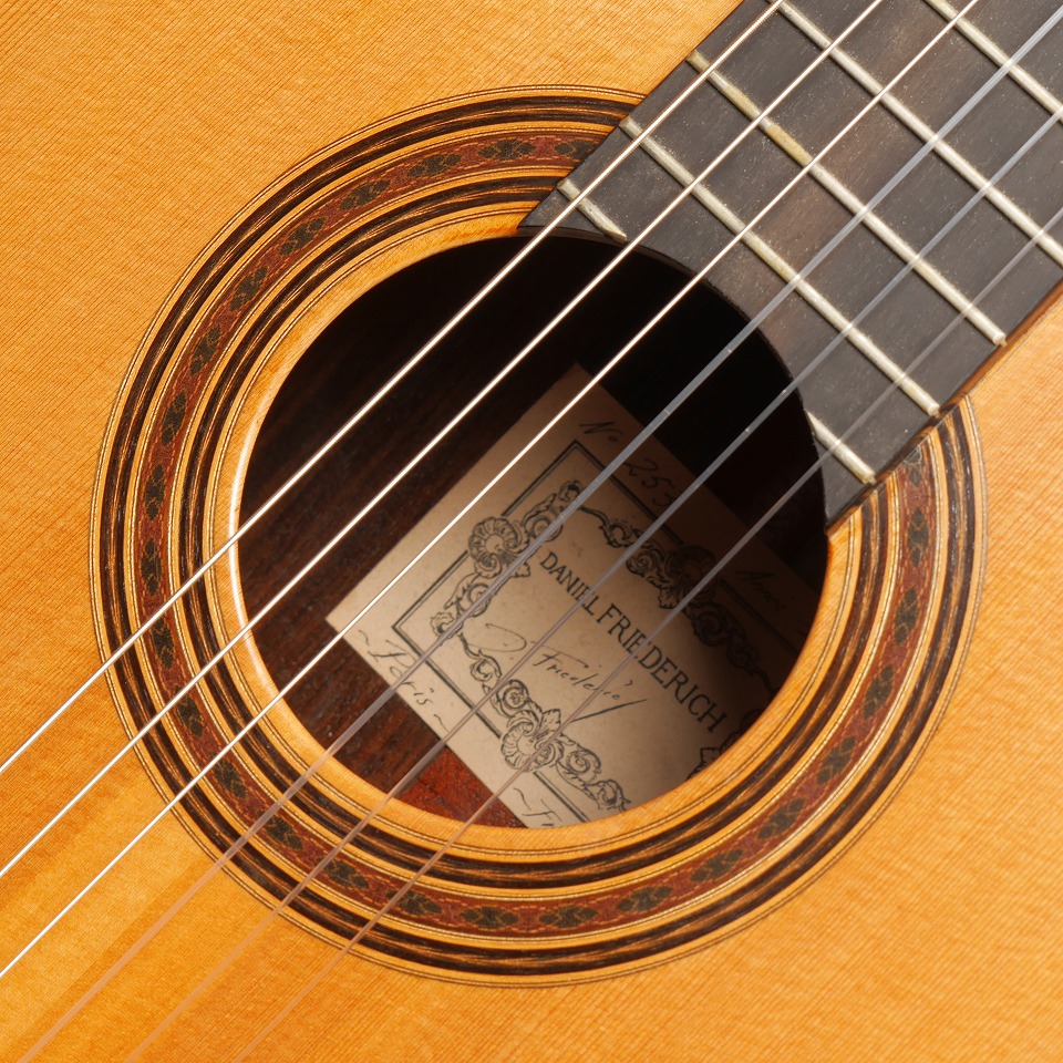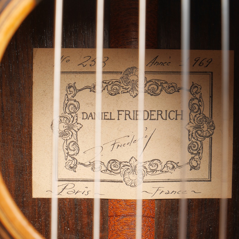 本ギターは、フランスを代表するギター製作家、ダニエル・フレドリッシュ(Daniel Friederich)氏による1969年製の一本です。幼少期より祖父の家具製作工房で木工技術を磨き、22歳でイダ・プレスティの演奏に触れ、ギター製作の道へ。その道のりは、ロベール・ブーシェやプレスティとラゴヤといった巨匠たちの助言を受けながら、本格化しました。