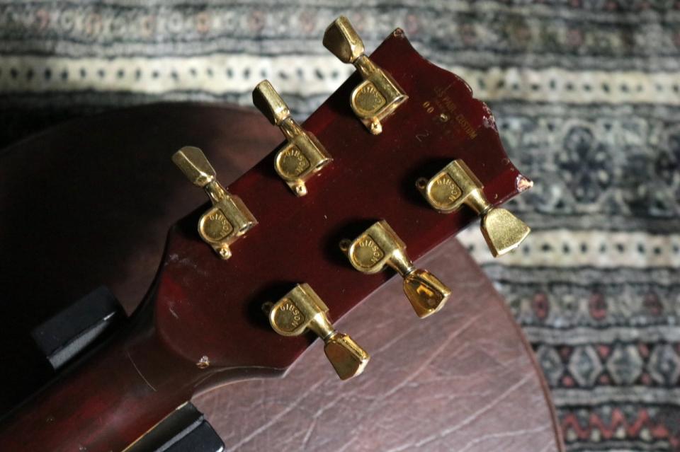 1954年にギブソンの看板モデルの上位機種として登場した「レスポール・カスタム」のワインレッドカラー、1976年製が入荷しました。重量は4.68kgです。