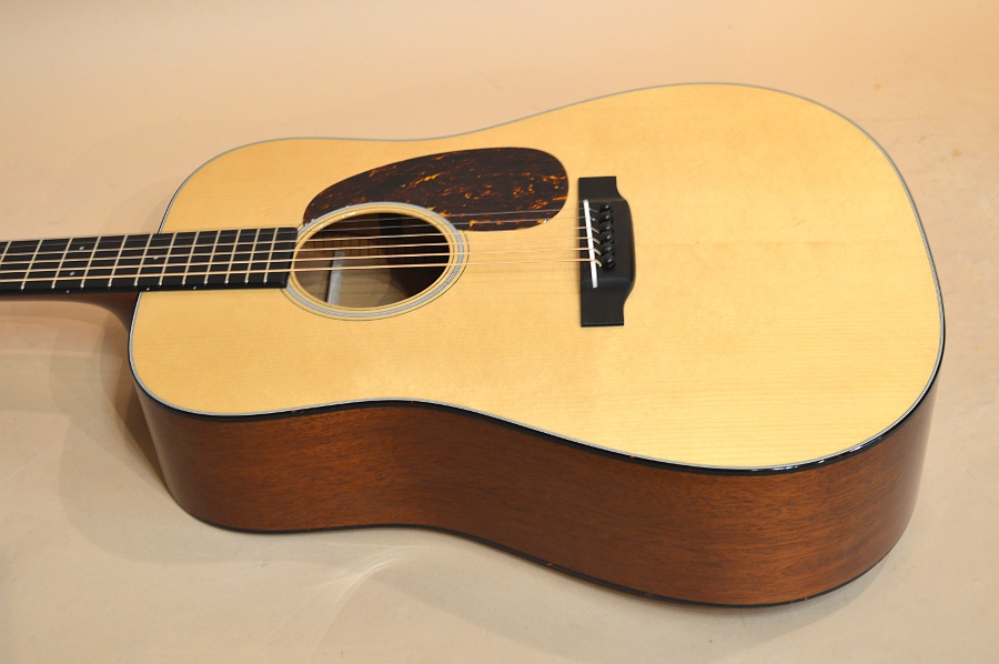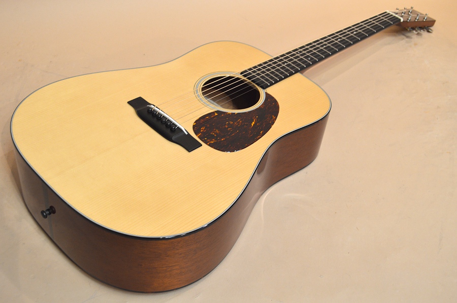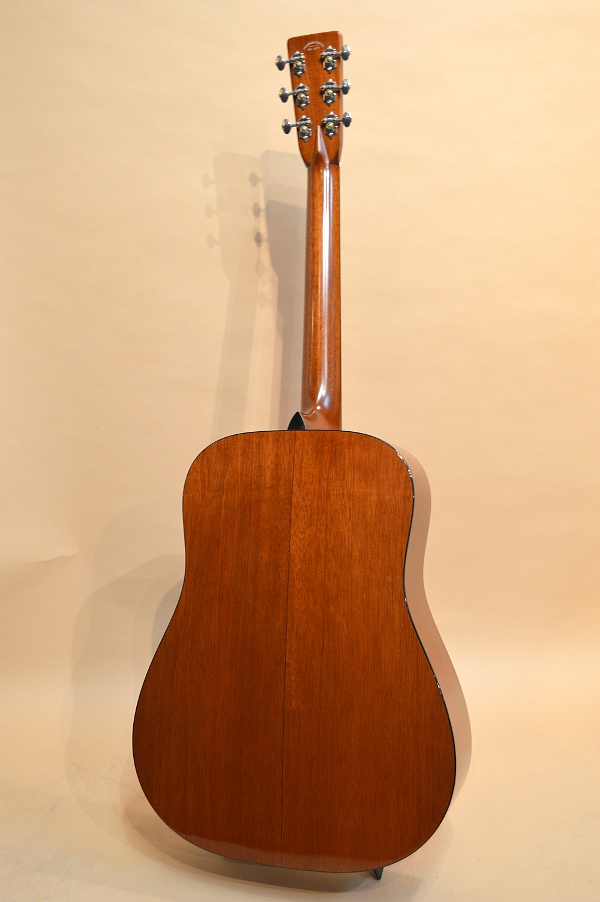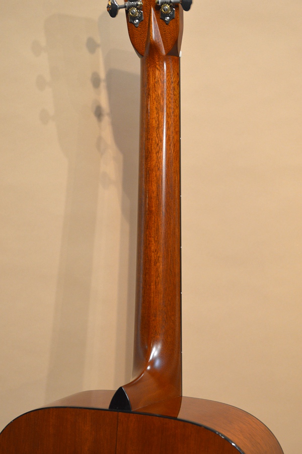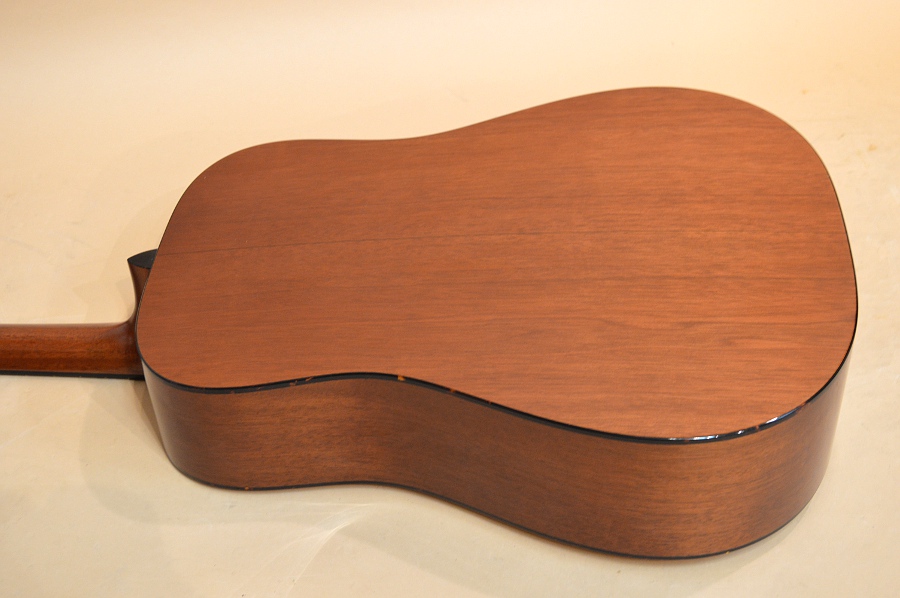 そのサウンドは、キューバン・マホらしいアタッキーでブライトに抜けるサウンド!通常のホンジュラス・マホガニーのサウンドに慣れた耳で聴くと、とてもマホガニーとは思えないようなエッジ感とブライト感があります。よくホンジュラス・マホとキューバン・マホの違いは、インディアン・ローズウッドとハカランダのサウンド傾向の違いに例えられますが、まさにローズウッドで言うとハカランダのようなエッジ感とブライトな抜けを持ったのがキューバン・マホ・サウンドの特徴かと思います。少し細めで高いブレーシングの影響もあって、より直進性に富んだ爆発力のあるサウンドになっているように感じます。エボニー・ロッド・ネックに関しては、、ネックの強度が強くなっている分、マーチンのエボニー・ロッドのようなふわんと鳴る感じはまるでなく、正直あまりエボニー・ロッドらしいサウンドとは言えないように思います(笑)。金属のトラスロッド・ネックのような金属質な倍音は抑えられているように感じますが、、。フラットピックで掻き鳴らせば、音の立ち上がりが良くエッジ感のきついブライトでラウドな豪快サウンドを響かせます。フィンガーで爪弾いても、キューバン・マホの反応よい音の立ち上がりに、マホらしい透明感のあるサスティーン、スキャロップ・ブレーシングの深みのあるリバーブが絡み、うっとりするような美しい音色を存分にご堪能頂ける事と思います!