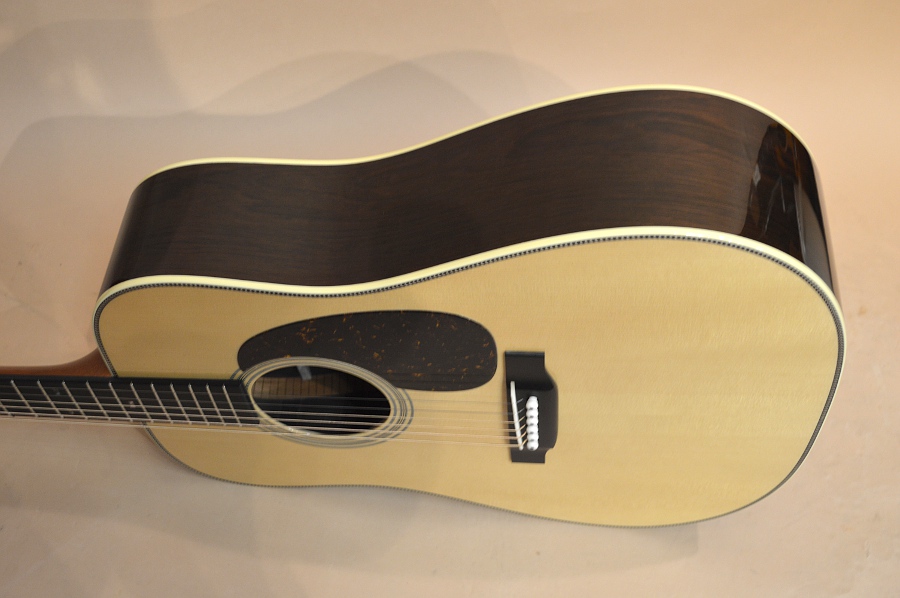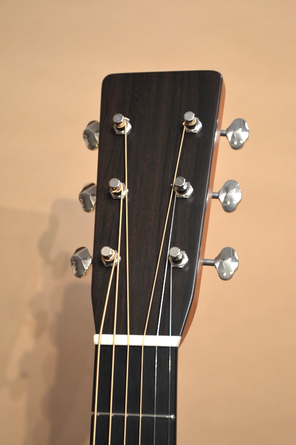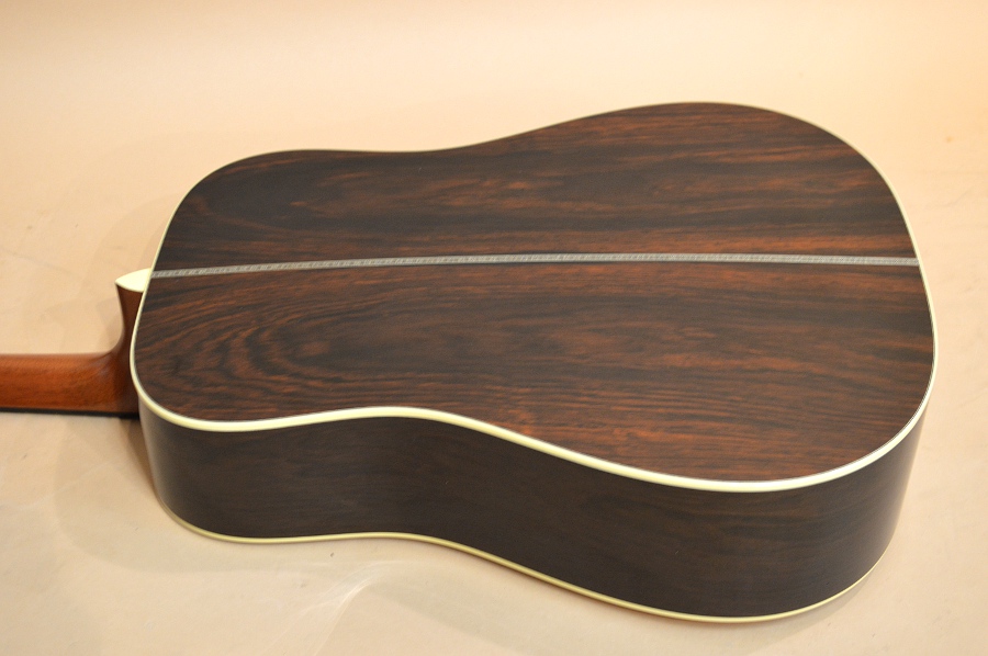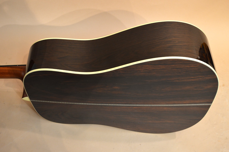 セレクト・アディロンダック・スプルースTOP、セレクト・ブラジリアン・ローズウッド(ハカランダ)SIDE&BACK、セレクト・キューバン・マホガニーNECK、エボニー指板&ブリッジ、ロング・スロット・サドル、’34スタイル・セミ・フォワード・シフト・スキャロップ・ブレーシング、実測44.5mmナット、645mmスケールのヘリンボーン・ドレッドノート・ボディー。使用材はもちろんの事、細かい箇所にもカスタム・オーダーならではのこだわりが満載です。まず、このポジション・マーク、おや?と思う方も多いかと思いますが、こちらはオーダー主様の百瀬愛が強すぎて出来たポジション・マークになります(笑)。百瀬さんのイニシャルY.Mをポジション・マークとしてデザインできないか?との依頼から、委託主様と百瀬さんで考案されたポジション・マークになります。百瀬さんのイニシャル、YとMが重なっているように見えるでしょうか?そしてブレーシングは百瀬さんお得意の’34ブレーシングながら、より爆発力と直進性に優れたサウンドを狙って少し浅めのシャロウ・スキャロップになっています。SIDE&BACKのハカランダはどちらかと言えば板目ですが、当時ヘッドウェイでストックしていたハカランダ材全ての中から選んだ最上級の物が使用されていますし、ネック材にはキューバン・マホガニーを使用するなど、こだわりまくった至高の1本になります!