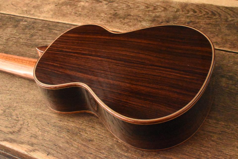 ボディトップには本郷氏の工房で完全に天然乾燥されたシトカスプルースを使用。通常のシトカスプルース とは明らかに異なる太く艶のあるサウンドが特徴です。サイド&バックには美しい木目と色味が特徴のローズウッドを使用。マホガニーネック、ローズウッド指板&ブリッジ。エボニーナット&サドル。