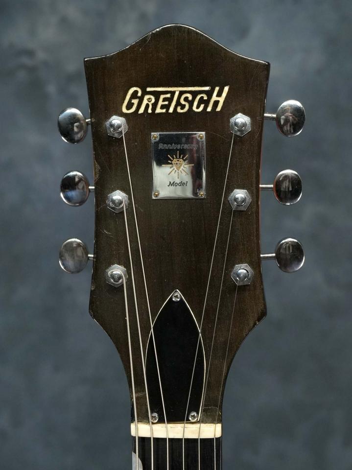 Gretsch社の135周年を記念して1958年に発売されたアニヴァーサリーモデル。一般的に「記念モデル」では数量や製造年が限定されている事が多いものの、仕様を変えながら1958年~1971年まで約23年に渡って製造されていたロングセラーモデルで、ピックアップの数やカラーヴァリエーションなど複数のモデルが有る中で、本器は1958年の発売から1959年までの約2年程と短い期間のみ製造された「”PAF”フィルタートロン・ピックアップ」搭載の1959年製 Gretsch 6124 Single Anniversary です。