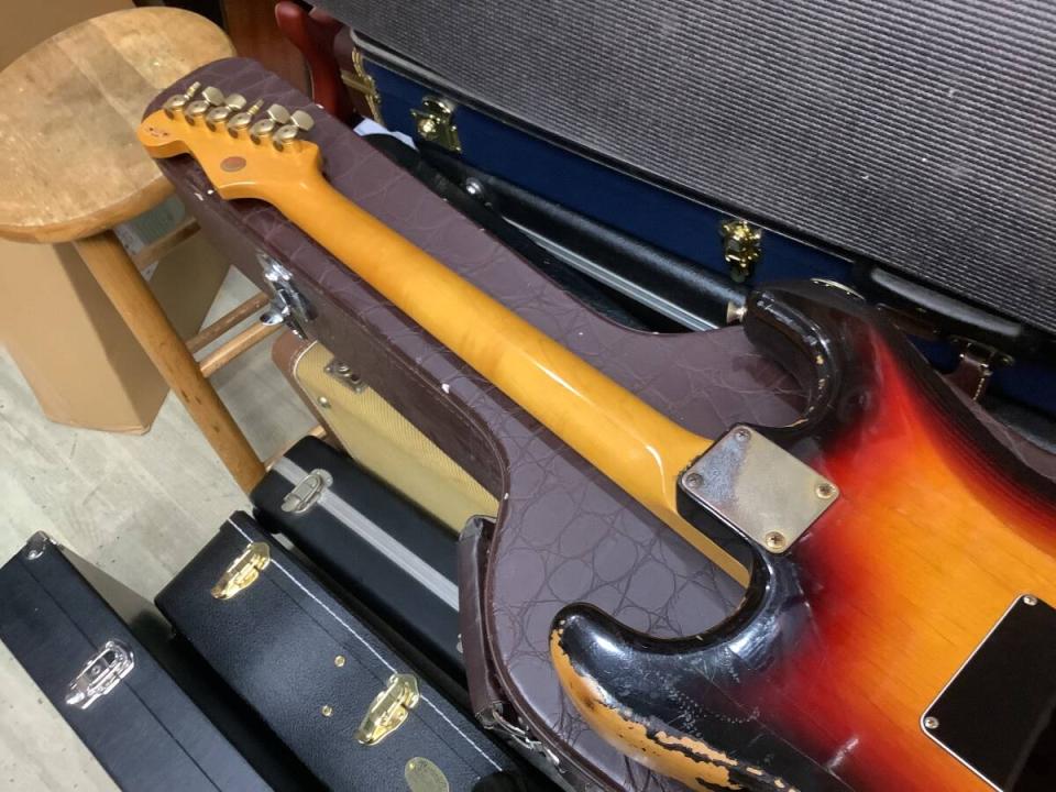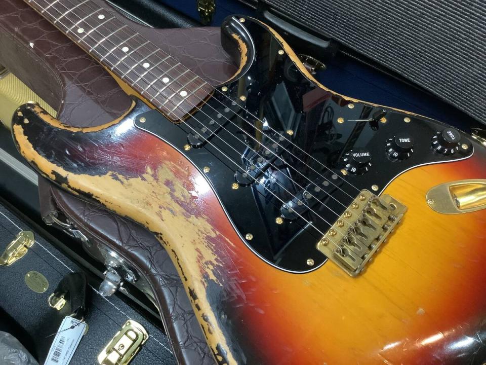 風格のあるStratocasterです。Goldパーツにボディのレリック加工でVintageの趣と、いい音色がわかるオーラのある本体です。