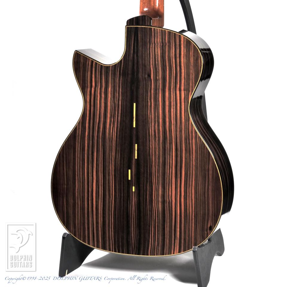 本器はシンカーシダートップとエボニーサイドバックのエキゾチックなOM Cutaway (Ebony)。サウンドメッセin大阪2025出展作品