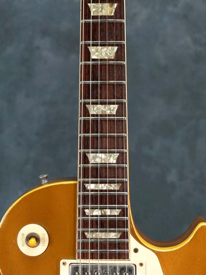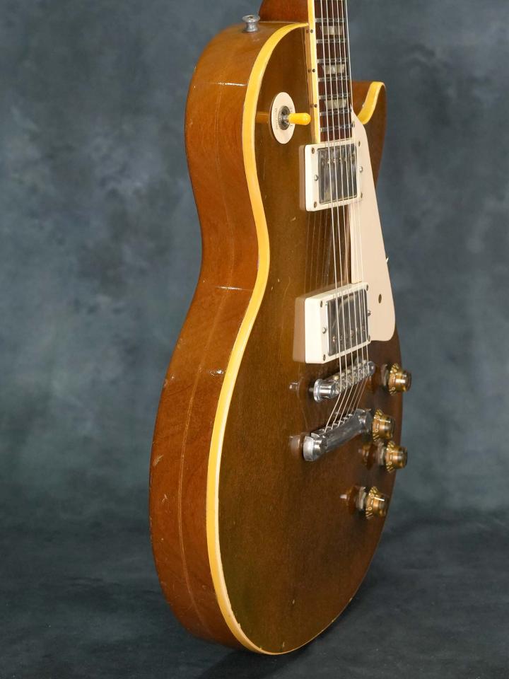 使い込まれた事で色焼けたゴールドトップにエイジングとは雰囲気の異なる自然な使用感やウェザーチェック、ハムバッカーへのコンバージョンに加えて雰囲気の良いリプロパーツを採用する事で70sながら50sのような雰囲気も感じるルックス、しっかりしたウェイトによる輪郭が有りながら適度に枯れたレスポールサウンドが心地よく、渋く格好良いゴールドトップをお探しの方にオススメの一本です。