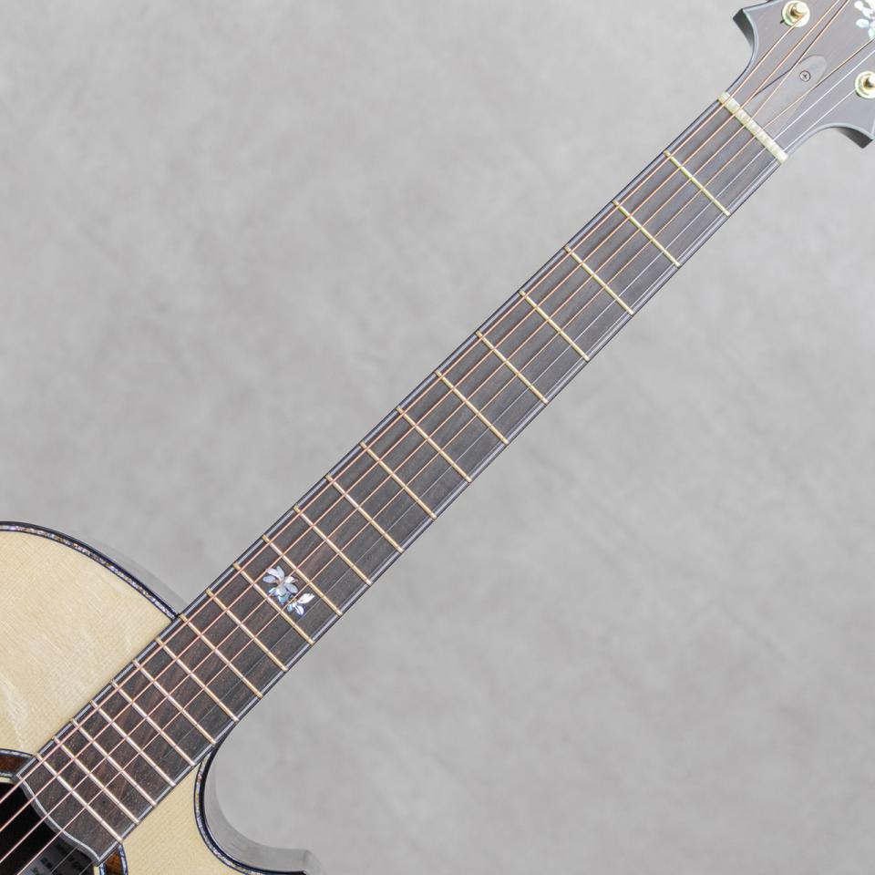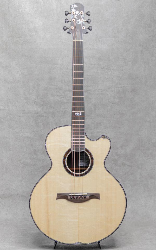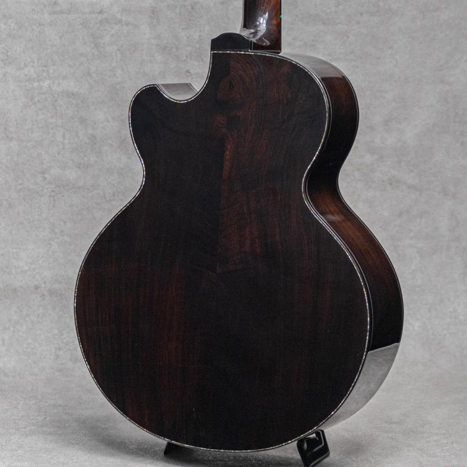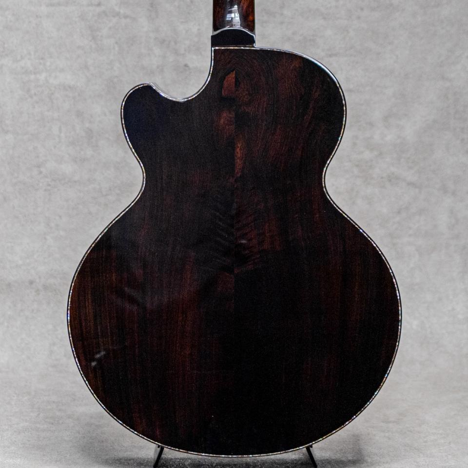 群馬にて増田明夫氏が製作する"Water Road Guitars"は、"音、弾きやすさ、デザインへのこだわり"を概念にオンリーワンのカスタムを製作しています。極上マテリアルを最大限に活かしたあふれる倍音、迫力のサウンド、稀代の天才が造り出す日本が誇るルシアーギターです。本器は氏の代表作かつ1番人気である41cmセミ・ジャンボモデル”Deep Arte Cutaway”。弊社三木楽器株式会社の創立200周年を迎えるにあたり、3本の特別モデルをオーダーさせていただいた記念モデルのうちの1本。江戸時代後期から続く弊社の歴史を受けて、江戸時代後期に活躍した葛飾北斎の書画をモチーフにデザインされており、本器には”文鳥 辛夷花”にインスパイアされたインレイがヘッドと指板に施されています。また、アニバーサリーモデルと言うことで、マテリアルにも特別な材を使用していただいています。トップには全面に水面のようなベアクロウ杢が浮き出て揺らめく極上のベアクロウジャーマンスプルース、サイド&バックには美しい毛柾目かつフィギュアド杢の浮き出る黒々としたオールドグロウスハカランダを贅沢に使用。また、本器ではさらに贅沢にネック材に削り出しのハカランダ材を使用しており、サウンドはもちろんハカランダマニアにはこの上ない満足度をもたらしてくれる絢爛な1本に仕上げられています。ハカランダ指板&ブリッジ、ハカランダヘッドプレート&ヘッドバックプレート、ハカランダバインディング、ハカランダ&アバロンロゼッタ、ゴールドゴトー510H.A.P.Aペグ&ハカランダウッドノブ、ゴールドフレット、ディクロラム指板サイド&ブリッジピンドット、クリアピックガード、アバロントップ&バックトリムインレイ、ブルーカラードのトリムパーフリング&エンドグラフト。今回の作には熱く粋な増田氏のはからいで、ヒール形状、指板エンド形状、ブリッジ形状まで特別なデザインを使用されており、ヘッド形状と同様の美しい流線形を持っており見ているだけでも惚れ惚れする美しさです。ヘッドと指板に配された”文鳥 辛夷花”デザインのインレイも、可愛らしい文鳥と美しい辛夷の花を味わい深く上品な落ち着きある色味の貝で描写。江戸時代から続く歴史をノスタルジックかつエレガントに表現されています。そして気になるそのサウンドは、出来立てホヤホヤにも関わらず、大音量かとワイドレンジに轟く圧巻のサウンド。氏の得意とする肉厚で重厚な響きを、ハカランダネックならではのサスティンの効いたトーンで、野太くかつゴージャスに魅せてくれます。日本が誇るルシアーギター、ウォーターロードギターの真骨頂を十二分に味わえる本器。愛でてよし弾いてよしの日本が誇るベテラン製作家増田明夫氏渾身の1本。周年モデルならではの気合いの入り具合位をそのお手元でご体感ください。日本製オリジナルハードケース(ブルーカラー)が付属します。