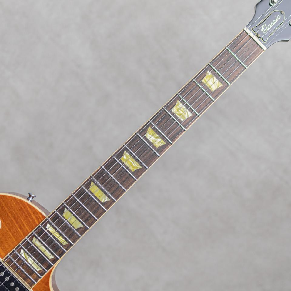 ブックマークする 値下げ通知に登録1990年発売開始の"Les Paul Classic"は"Historic Collection"の前身にあたる"Les Paul Reissue"に準ずる形で登場、並行して販売されていた"Les Paul Standard"がLate70's以降の系譜、ナッシュビル製レスポール然とした仕様であったものに対し、"Les Paul Classic"ではニッケルパーツの採用などヴィンテージフィールなスペックが魅力。本器は近年ではなかなか見られないAAAフレイムメイプルトップを採用した2001年製"Les Paul Classic Premium Plus Lemon Burst"。 クルーソンスタイルペグ、1960モチーフのスリムテーパーネックシェイプ、ビンテージスタイルのABR-1チューンOマチックブリッジ、ニッケルハードウェア。その他"Les Paul Standard”との差別化としてスリムテーパーネック、ハイパワーなセラミックマグネットピックアップの496R/500Tのコンビネーション。各所でリイシューモデル的な主張をしつつ、プレイヤビリティとサウンドにおいてはむしろモダンな要素を持ち、"HR/HM向けなLes Paul"という評価がされた二面性もまた、本器の魅力的なキャラクターと言えます。こちら全体的に細かな傷、ラッカー塗装の引けや僅かな跡等はあるものの、顕著に外観を損なうダメージはなく、経年を鑑みると比較的綺麗な外観。ネックのコンディションも良く、現状ローアクションのセッティングでも抜群のプレイヤビリティです。"Premium Plus"では派手に映えるトップの杢目を活かし、新品販売時にピックガード非装着がデフォルトでした。こちらオリジナルピックガードは欠品しているものの、整った杢が大きく揺らめくこのトップであればノンピックガードのままが良いかもしれません。重量も軽くバランスの良い一本。ぜひお見逃しなく。オリジナルのハードケースが付属。