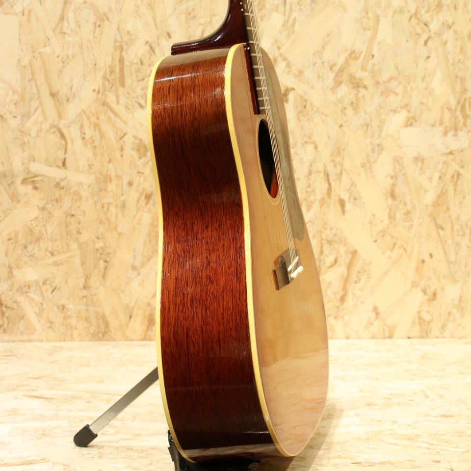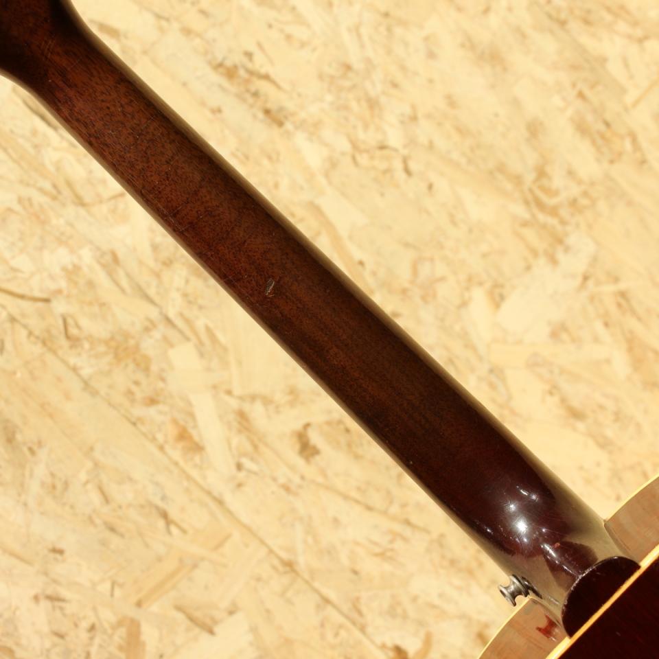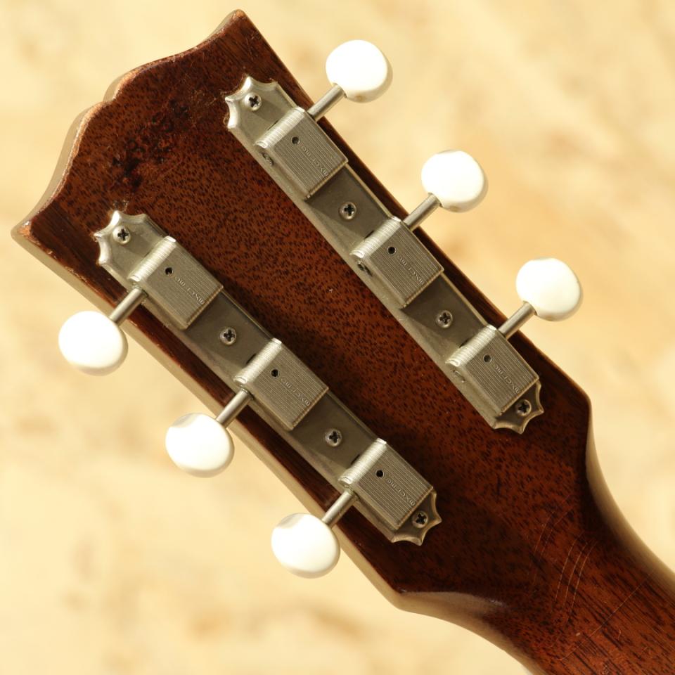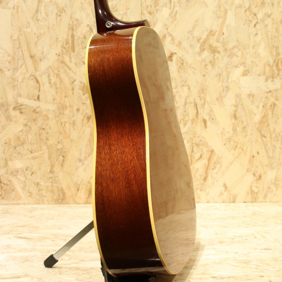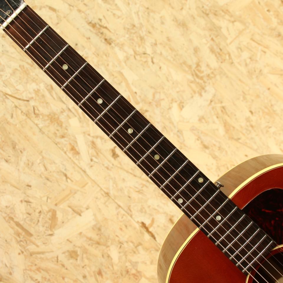 1942年の登場より不動の人気を誇るJ-45。現在に至るまでアコースティックギターシーンのトップを走り続けるロングセラーモデルです。本機は50年代後半と60年代前半のスペックを併せ持つ"J-45"。1961年製Vintage品。スプルーストップ、マホガニーサイド&バック、マホガニーネック、ハカランダ指板&ブリッジ、ノーマルストレートサドル、オリジナル・シン・ポインテッド・ラージピックガード、シングルリングロゼッタ、ワンライン3連クルーソンタイプペグ、ノンスキャロップドXブレイシング。60年代の極初期に見られる色味の濃いダークチェリーサンバーストを備えたJ45。スキャロップ期から1955年頃にノンスキャロップへと変更が入った歴史を持つJ-45。そこからも年々ブレイシングの高さや幅が変わるなど年を追うごとにサウンドの傾向が変わっていきます。本器の頃には細く高い形状へと変化しており、シャープな音色とスピーディな反応性を獲得しています。50年代の太く甘く泥臭さを感じる音色からスッキリと輪郭感のある響きへ、それでありつつも箱全体で増幅しているような空気感のある響きも持ち合わせます。60年代前半のADJと比べるとよりダイレクトなレスポンス、コシのあるサウンド、音色の太さが武器となるでしょう。一度触ると病みつきになるであろうGood Soundの1本です。ネックヒールサイドにストラップピン装着。ブリッジプレートは当時の接着剤を使用していない為リプレイス、同時にブリッジも交換されていますが、両者とも非常に精巧に作られておりぱっと見では見紛うほどの仕上がりです。Vintageではよく見られるピックガードに沿って割れる木部クラックがピックガード内側、サウンドホール上部と下部に見られますが、両者とも接着と内部にパッチが施され問題なく使用できる状態となっています。上記修理跡こそ見られるもののその他には細やかな当てキズや擦れキズが見られる程度と良好な状態をキープされている個体。ネック周りの状態も良く、50年代後半と比べて薄くなったグリップ感も相まって高い演奏性を持っている1本です。50年代後半より演奏性とサウンドが変化、同時期のADJとはサウンドが異なる中間的な印象のJ45。ノーマルスロット故のコシやサスティーン、パンチ感が魅力的な個体です。また一味違った個性を持つ1本、是非ご検討下さい。