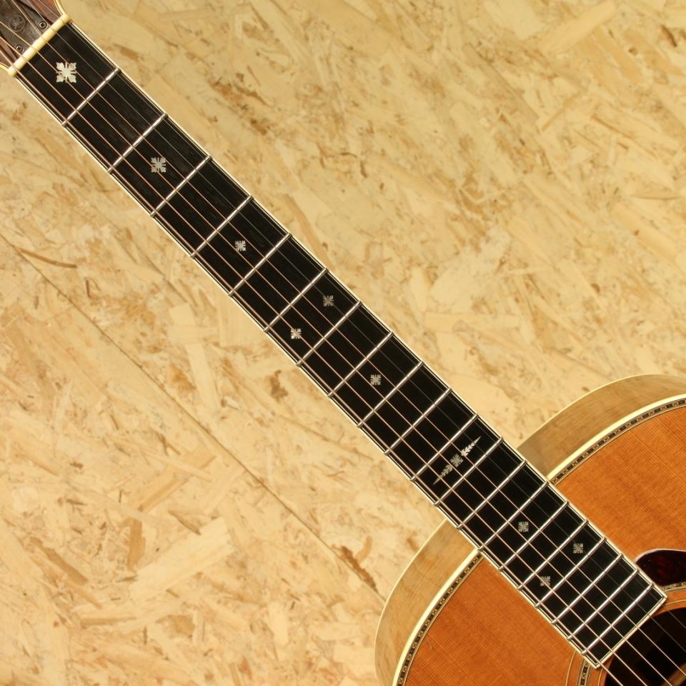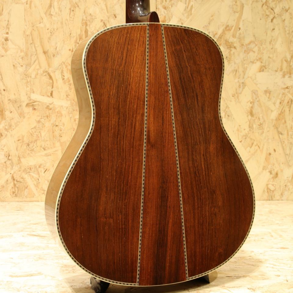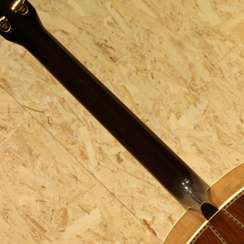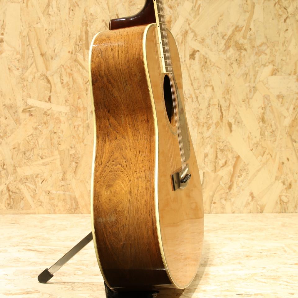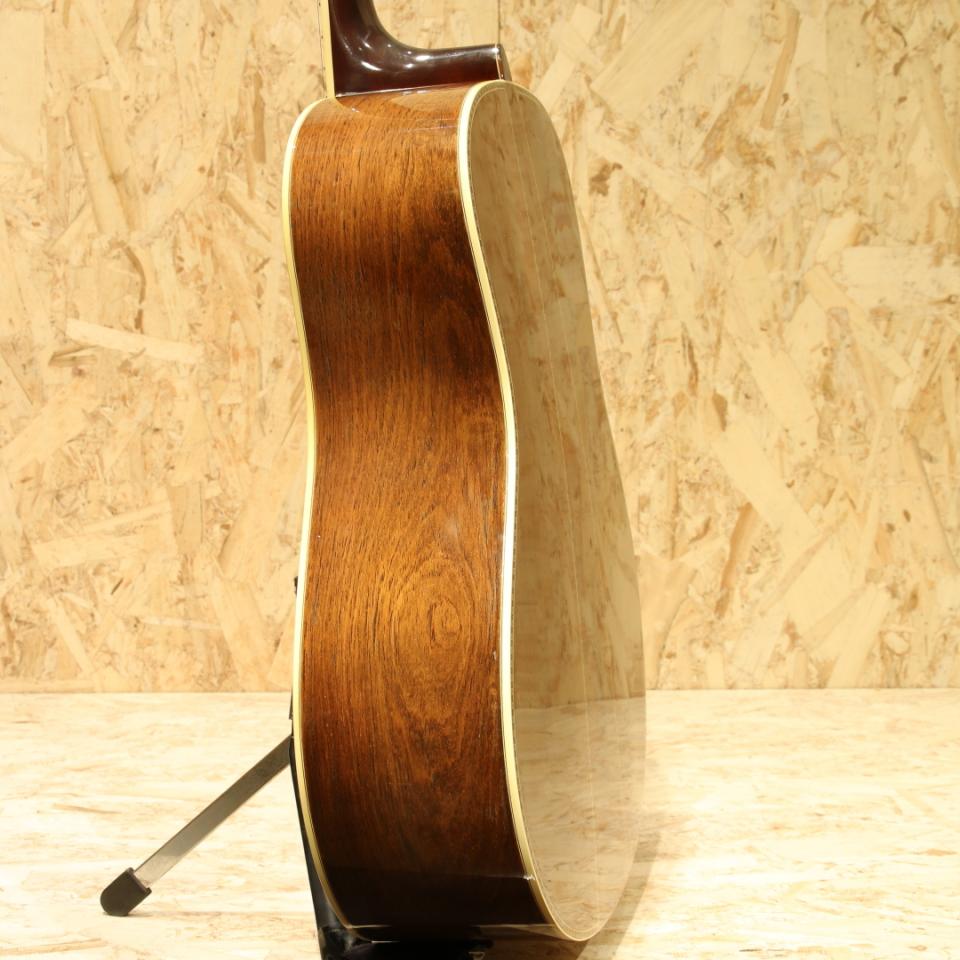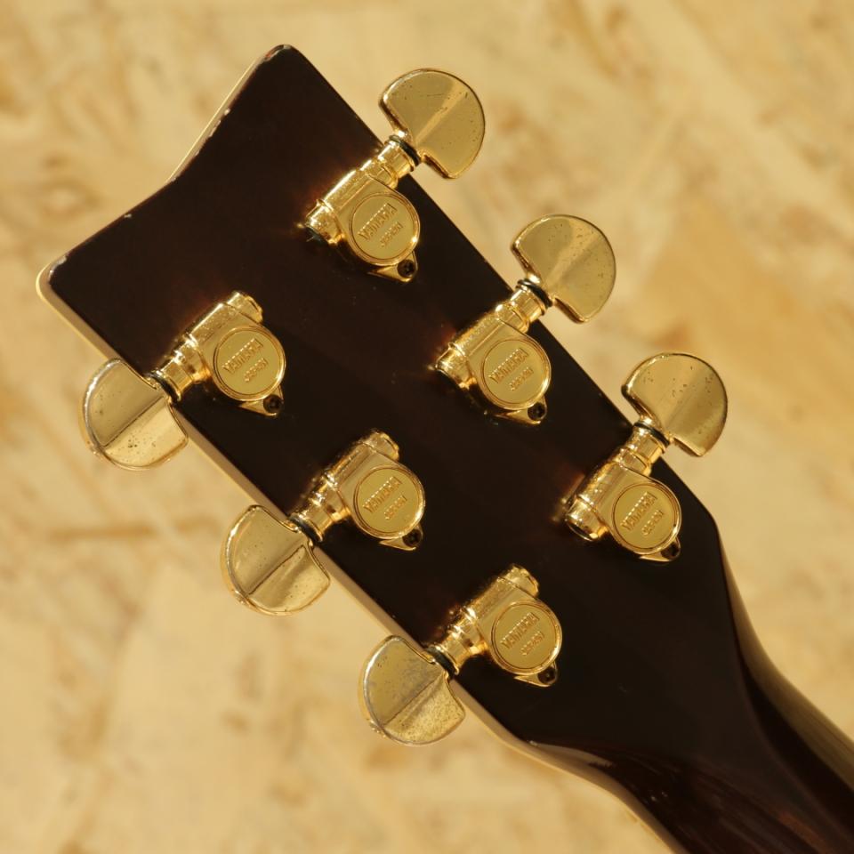 ヤマハLシリーズはLuxuryの名を冠された高級シリーズ。現在でも脈々とLシリーズは受け継がれており、その名に恥じないヤマハ独自の仕様をふんだんに盛り込んだ人気のシリーズです。本器はハカランダサイドバックを採用したL-15。1982年製のUSED品です。エゾ松トップ、ハカランダサイド&3Pバック、マホガニーネック、黒々としたエボニー指板&ブリッジ、オリジナルゴールドロトマチックペグ、オリジナル音叉マーク入りロッドカバー、オリジナルウッド指板インレイ、寄木ロゼッタ、ベッコウ柄ピックガード、ノンスキャロップブレイシング。L-15は1975年に発売開始された人気の単板ドレッドノートモデル。ハカランダを使用したサイドバックと豪華なスペックを与えられたモデルでした。この時期のヤマハの例に漏れず本モデルも前期型と後期型が存在し、大きなところではボディシェイプが変更となりました。L-10のようなウェスタンボディから、四天王L-53と同じジャンボボディへ。それに伴いポジションマークやロッドカバー形状も変化しています。この時期特有のクリアで磨き抜かれたような煌びやかさを持つヤマハサウンド。それだけではなくボリューム感も大きく感じられ、溌溂とした活舌の良さ。日本らしい特有の響きと言えるでしょう。一度かき鳴らせばフォークソングが始まるかのような、情緒あふれるノスタルジーな音色。爪弾けばスリーフィンガーを試したくなるフォーキーなトーンを持ち味とします。現代のモノと比べるとややVシェイプでやや太めに感じるグリップですが、握り込んで演奏するスタイルにはバッチリフィット。まだまだ現役で使えるヤマハギターです。ボディサイド6弦側ボトム箇所とくびれ箇所に塗装内部に若干の浮きのようなモノが見られますが、問題なく使用できる状態です。ボディトップ面下部の当て擦りキズや細やかな当てキズ、擦れキズ等見られますが40年余りの経年を考えるとキレイな状態をキープされている個体。ネック周りも整えられ未だ現役の1本です。日本のフォークブームを支えたヤマハトラディショナルモデルの"L-15"、古き良きジャパンフォークがお好きな方には是非、ご体感いただきたい1本です。