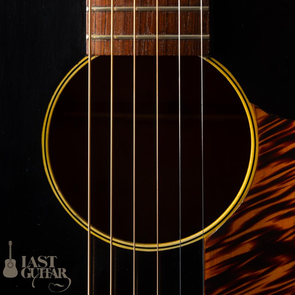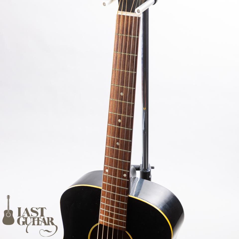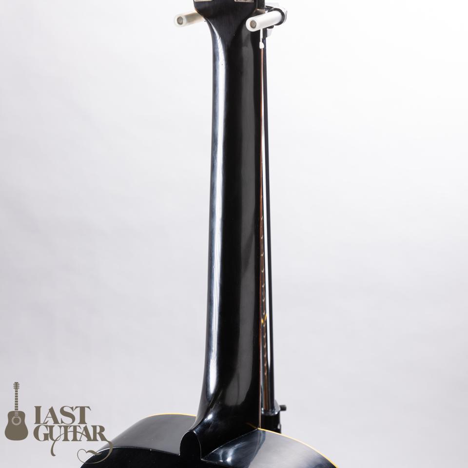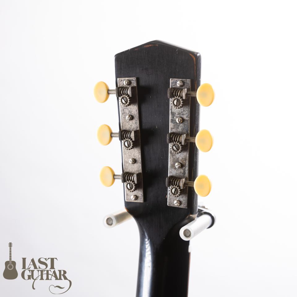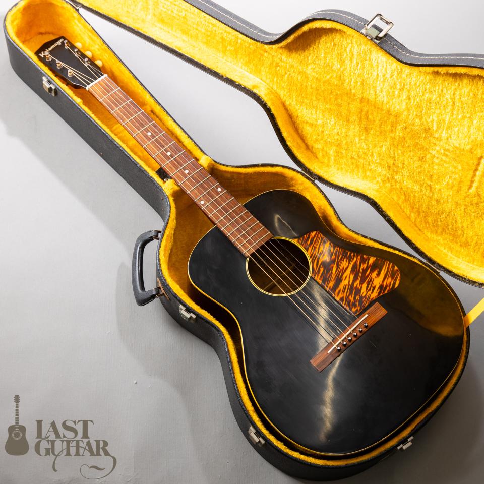 本機は、内容から判断して1936年から1938年あたりの製造と思われます。カラーは、リフィニッシュでブラックカラーに変更されておりますがとても雰囲気はマッチしています。14 3/4インチボディー、スプルーストップのマホガニーバック&サイド、トップバインディングのみ、ファイアストライプピックガード、カラマズーのシルクスクリーンロゴ、ナット幅は、約45ミリで少し丸みを帯びたVシェイプネックといった仕様です。