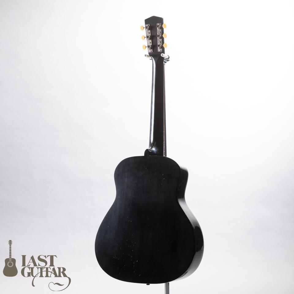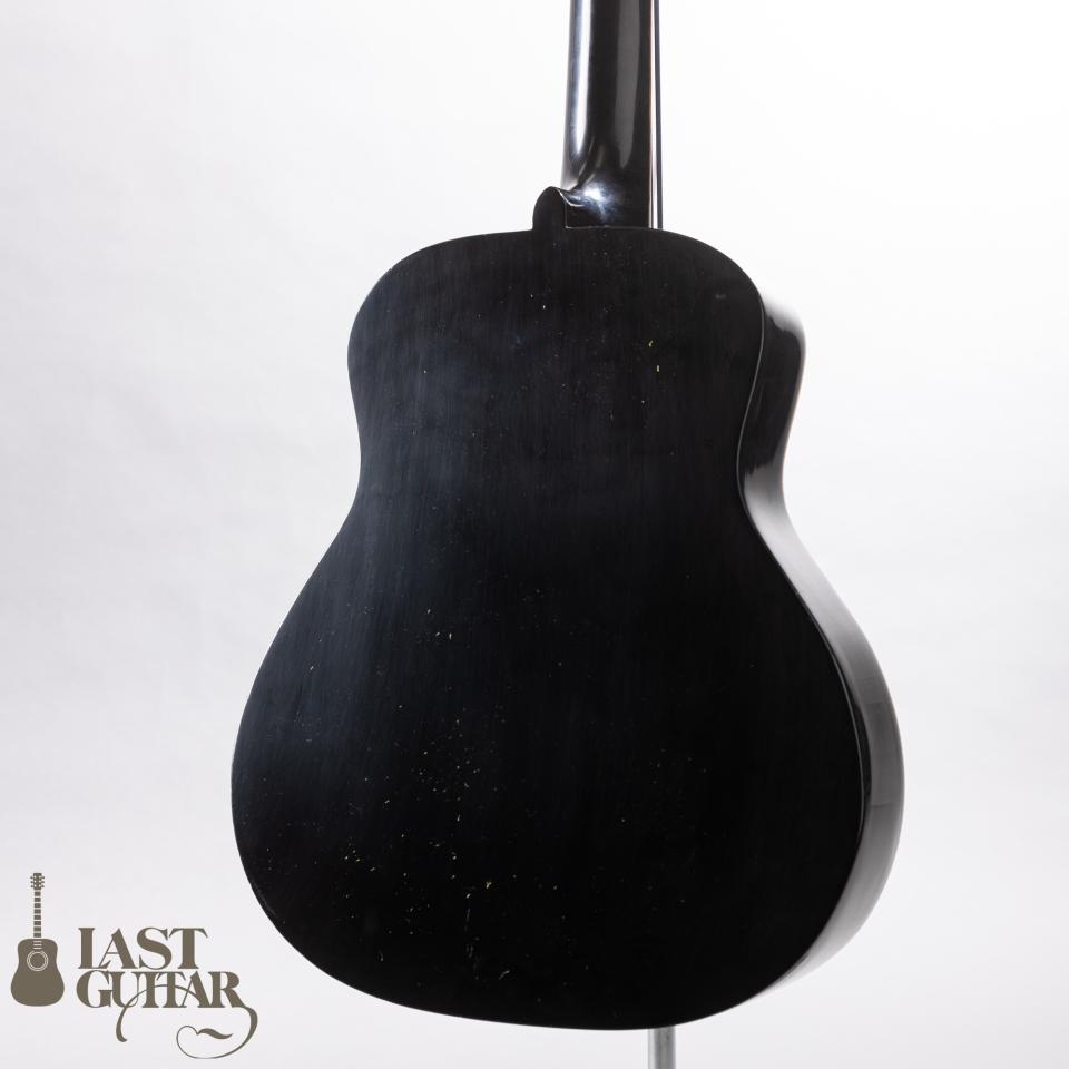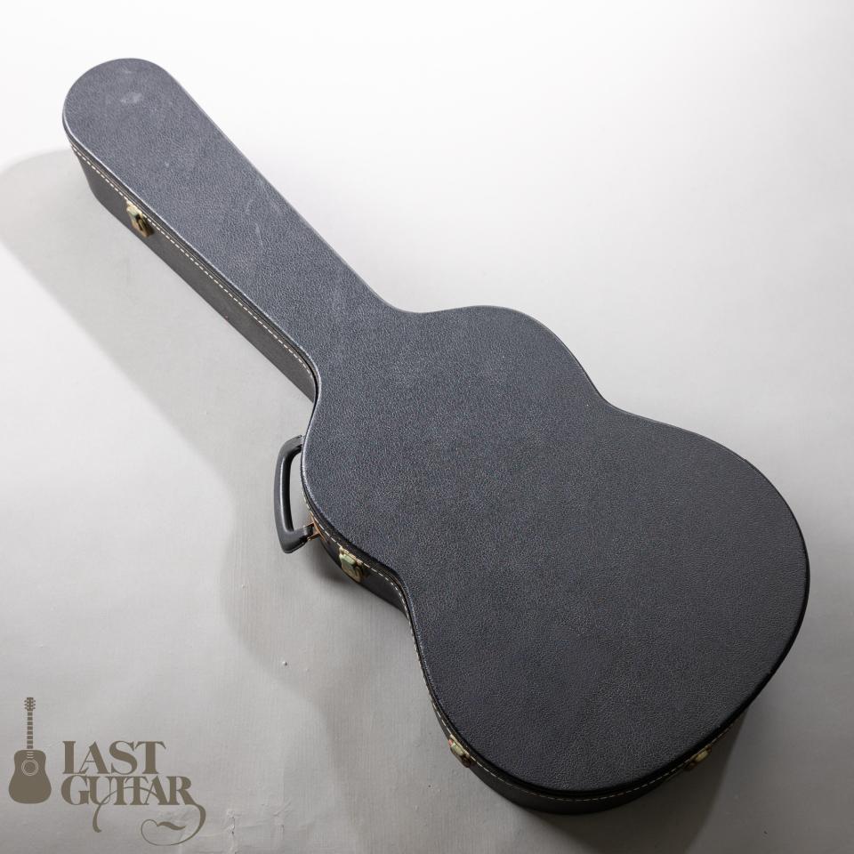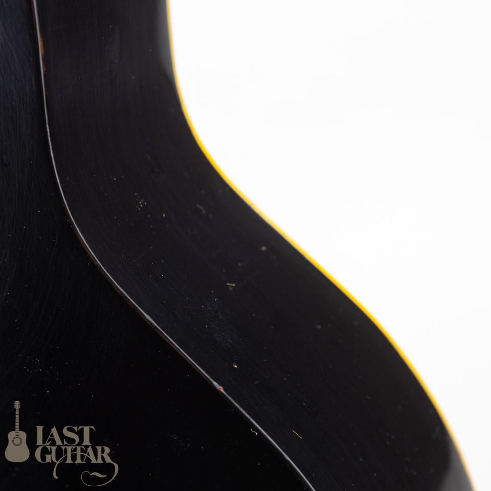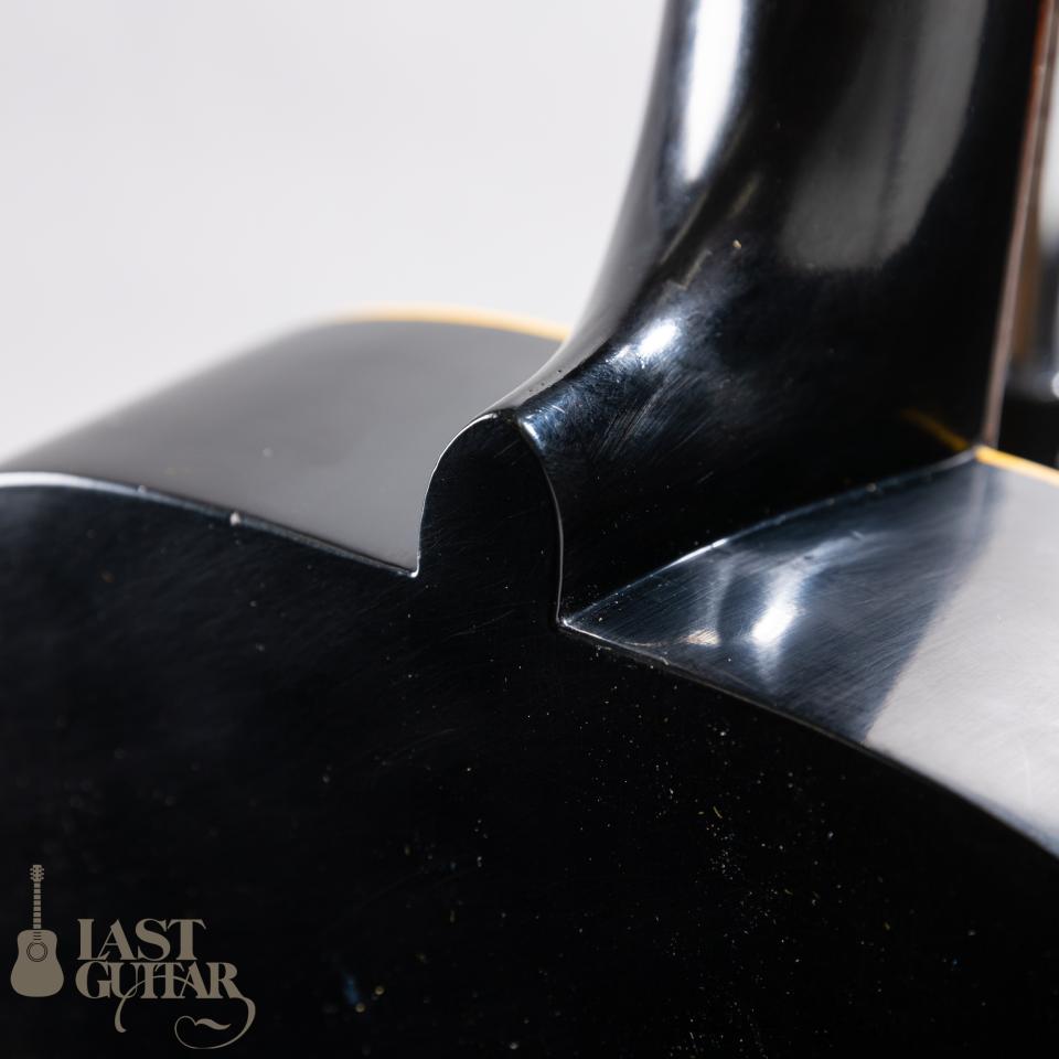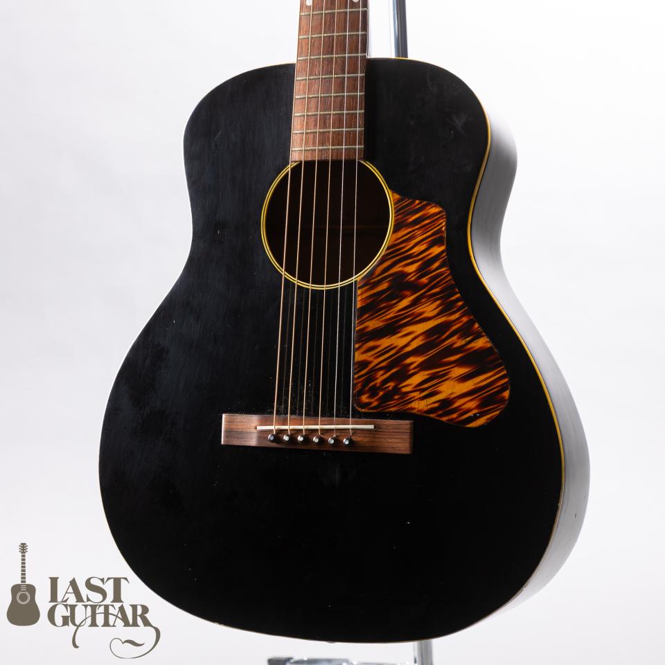 本機は、内容から判断して1936年から1938年あたりの製造と思われます。カラーは、リフィニッシュでブラックカラーに変更されておりますがとても雰囲気はマッチしています。14 3/4インチボディー、スプルーストップのマホガニーバック&サイド、トップバインディングのみ、ファイアストライプピックガード、カラマズーのシルクスクリーンロゴ、ナット幅は、約45ミリで少し丸みを帯びたVシェイプネックといった仕様です。