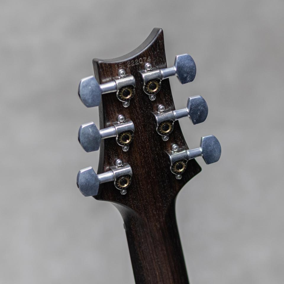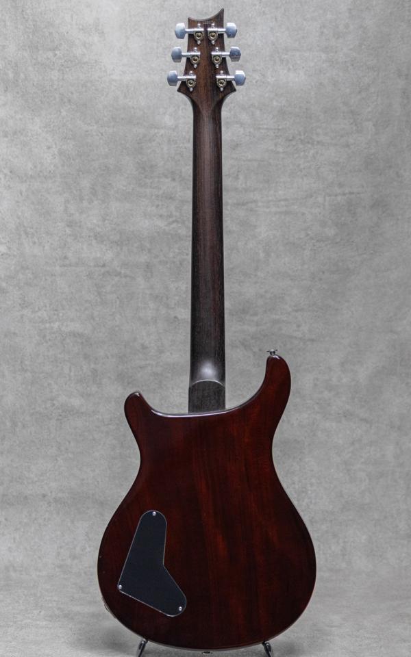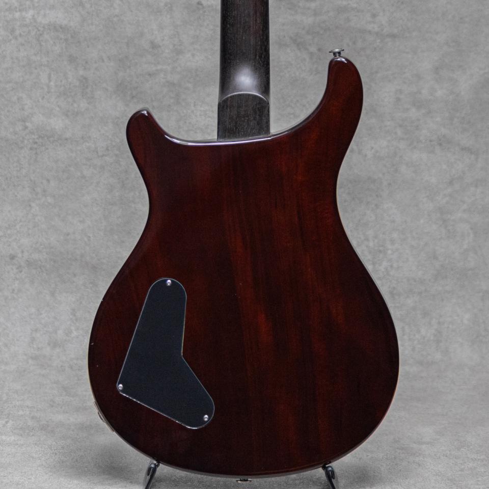 2013年登場の"Paul's Guitar"。Artist Gradeのフレイムメイプルトップに厳選されたライトウェイトマホガニーのボディマテリアル。ナロータイプの408ピックアップと直感的な操作性が良い各PUごとのコイルタップ・ミニスイッチを備えた、ポールリードスミス氏本人のシグネチャーとしてラインナップされるモデル。実践的かつ魅力的なサウンドバリエーションを持つモデルですが、加えて本器ではホンジュラスローズ指板、インディアンローズネックを採用し、よりクリアで高い解像度を実現したスペック。レンジが広く力強い出力を持ちながらも非常に繊細なタッチレスポンスが特徴で、艶やかでクリアに抜ける音像が抜群の完成度を感じさせるグッドサウンド。搭載されているNarrow408ピックアップはピックと弦が擦れる感覚すら拾いそうな閾値でありながら、入力に対するキャパシタンスも大きく、フロントポジションでの強いピッキングでも汚く飽和せず、鋭い歯切れでもって明瞭なトーンを弾き飛ばします。各PUごとに装備されたミニスイッチによるコイルスプリットのサウンドに関しても全く"か弱さ"を感じず、むしろP-90のようなウォームさと滑らかな挙動を魅力的にお楽しみいただけます。こちらイーグルタグのピックアップのスペックには"Paul's"と表記がされておりますが、フロントに"408 BASS"、リアは"BRENT MASON TREBLE"のステッカーが貼られております。もともと408ピックアップに関してはフロント/リアでサイズの異なるコンビネーションにて開発、製品化されたものでしたが、"Brent Mason Signature"でフロント用のNarrow408をリアにも搭載するリクエストがされ、ポール氏がこの仕様を気に入ったことから本モデル"Paul's Guitar"でも採用される流れとなりました。こちら塗装表面の細かな擦れやハードウェアのいくらかのくすみ等が多少ある他、ボディエンド側のエッジ付近に2㎜程の小さな塗装チップ、その他ごく小さな当て傷はあるものの全体に顕著に外観を損ねるダメージは無く悪い印象はありません。フレットの減りもさほど感じられず9割以上の残量、気になる凹みなどなく、ロッドの調整含め良好なネックコンデション。気持ちよく演奏していただける良いセッティングができております。サウンドルックスともに雰囲気抜群の完成度の高い1本。ぜひお確かめください。オリジナルハードケースが付属。