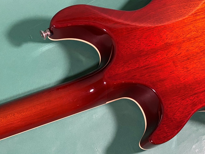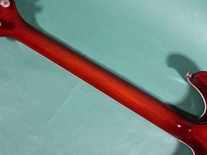 ネックはストレートでアジャストロッドも問題無く動作しております。ナット・フレット共にオリジナルで、フレットは9割程度残っております。スケールは24.625(62.5475cm)、ラディアス12、ナット幅42.6㎜で、ややしっかり目の握り易いソフトなVシェイプで緩めのテンション感で演奏性も良好です。