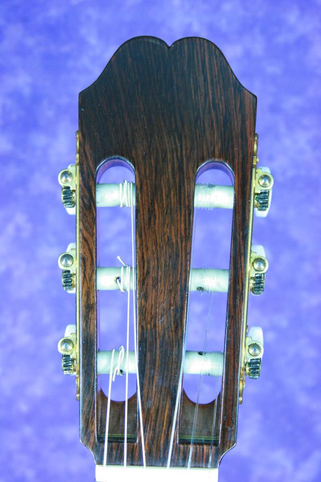 ネックは温度・湿度が変化しても狂いにくいマホガニーで、スペイン式一本棹方式でボディーと強固にジョイントされており、指板はエボニーです。