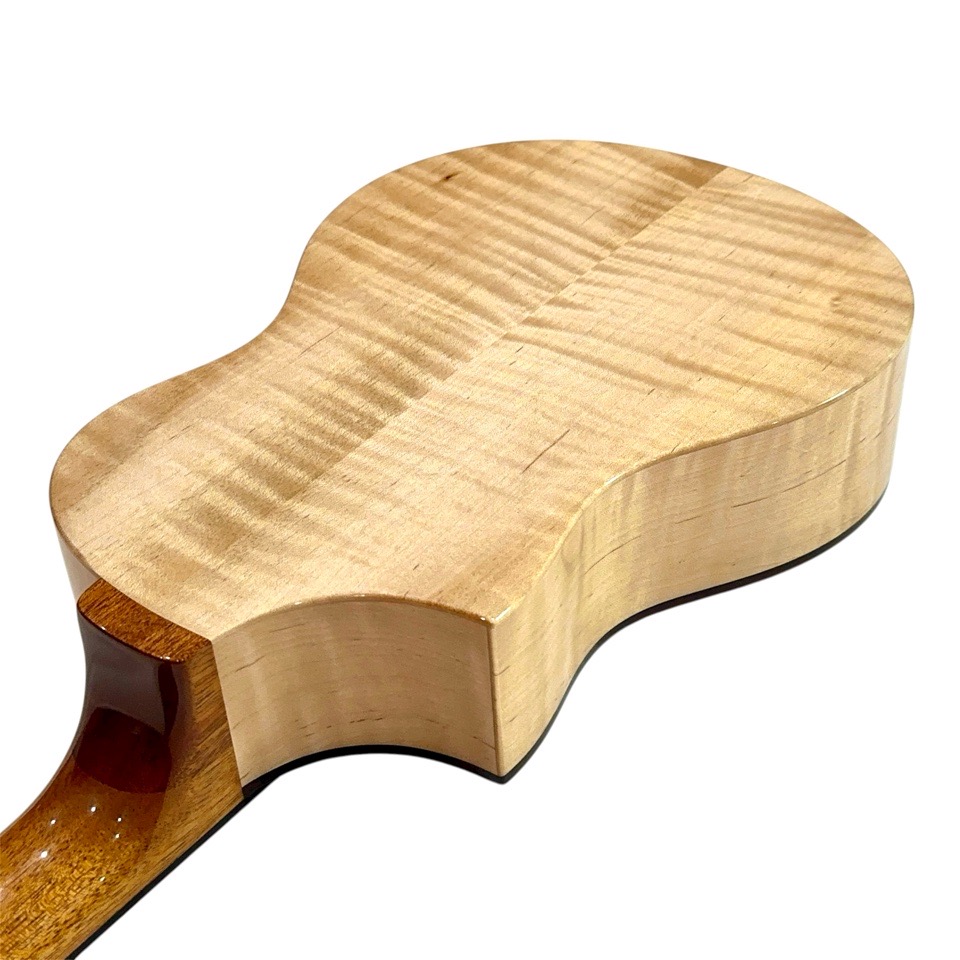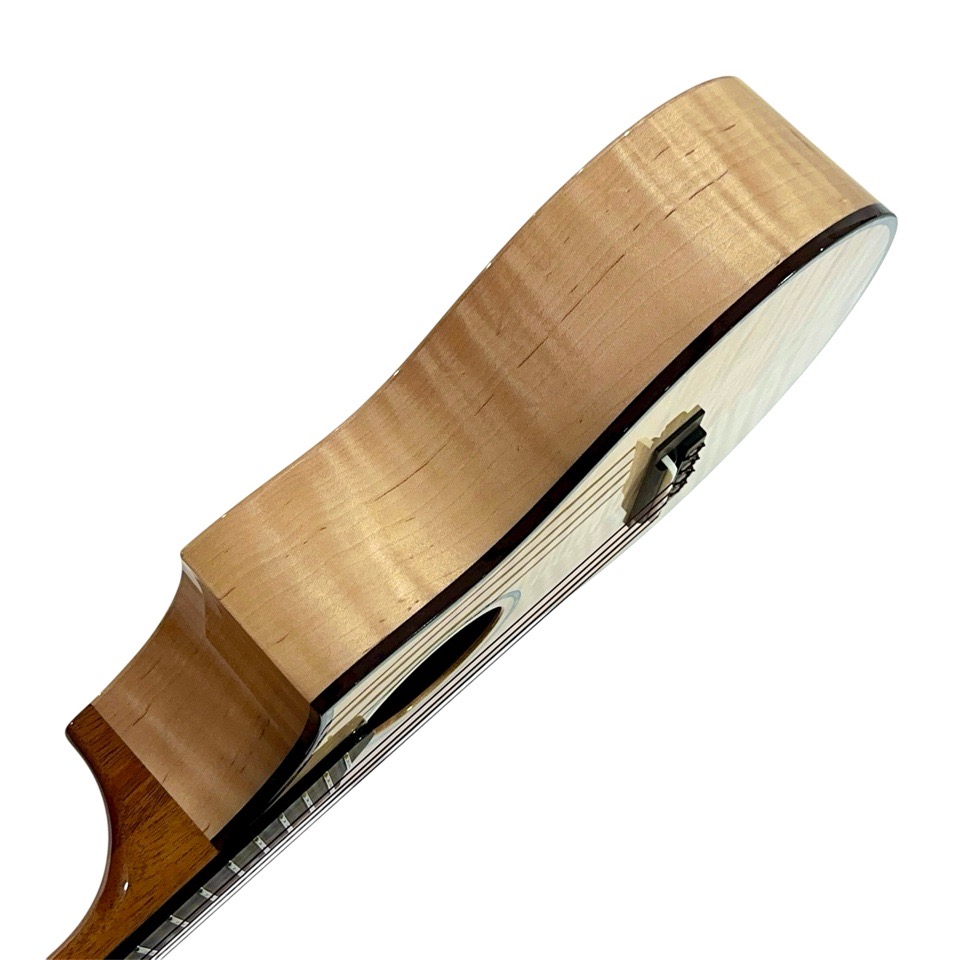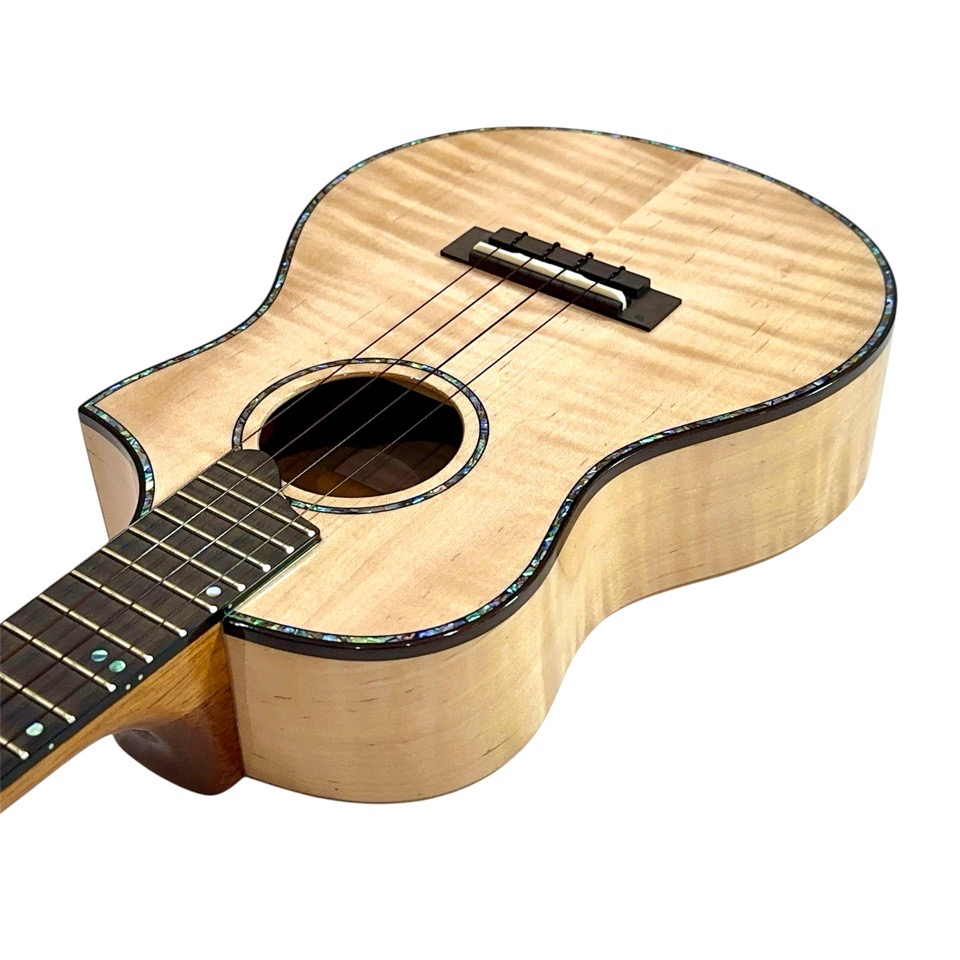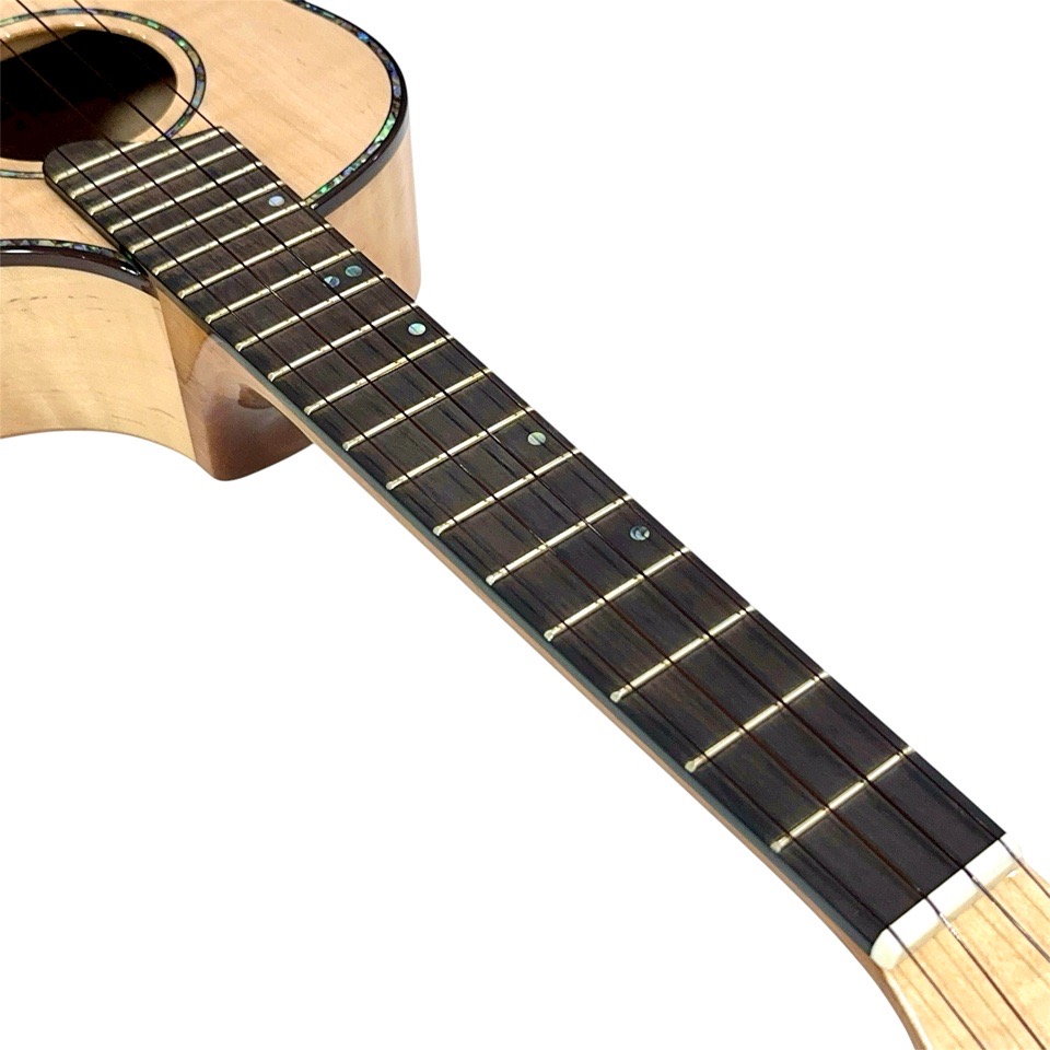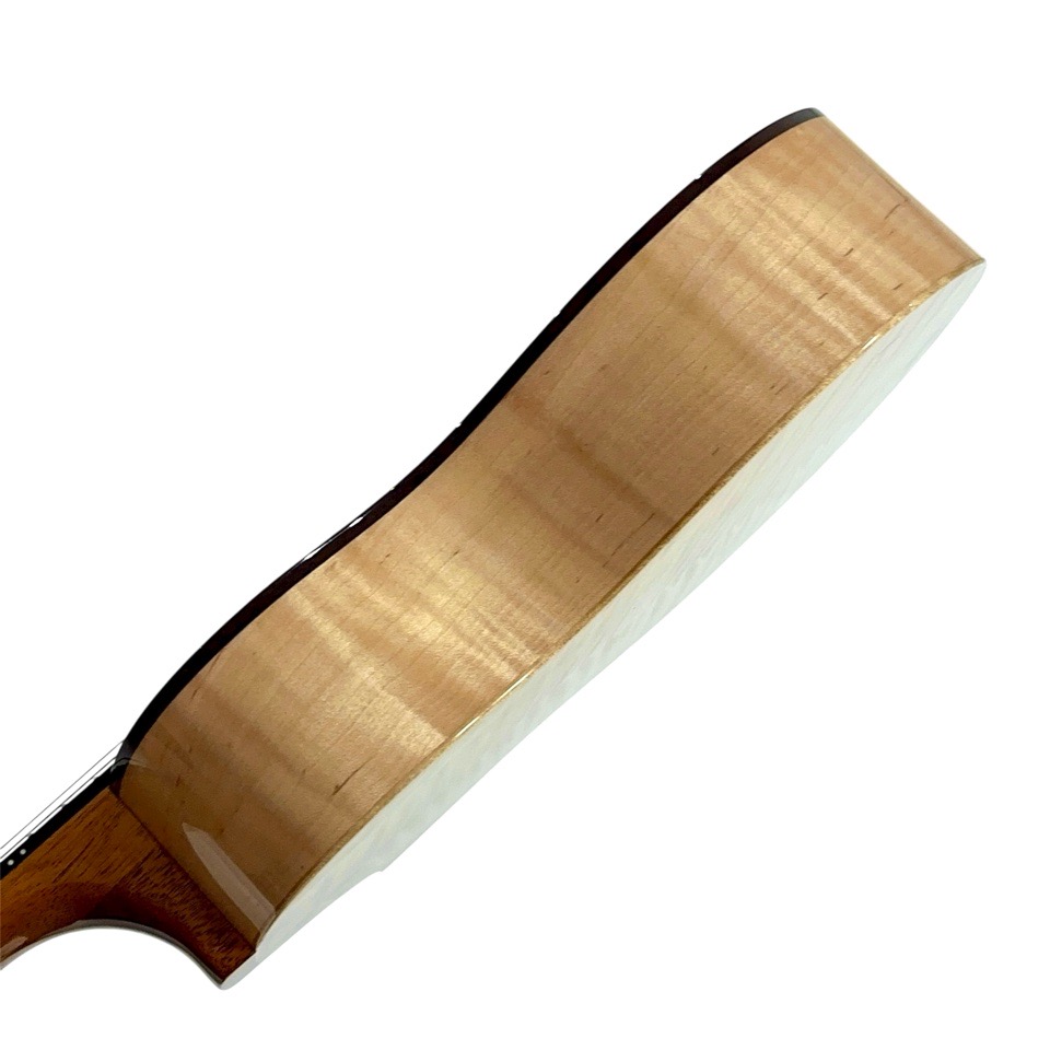 メイプル材は一般的に明るく硬質な音色を持つとされますが、本モデルではテナーのボディサイズで組み合わせることで、音に厚みと包容力が加わり、単なる明るさを超えた非常に深みのあるサウンドに仕上がっています。ひとつひとつの音がきらびやかに立ち上がり、コードを鳴らすと複雑な倍音が豊かに重なり合い、澄んだ響きの中に甘さとコシが共存。ストロークでは輪郭のはっきりしたサウンドが気持ちよく抜け、フィンガーピッキングでは繊細な表現がしっかりと伝わります。