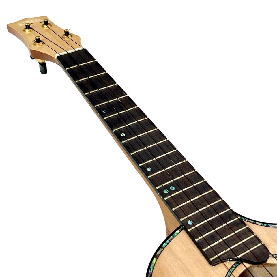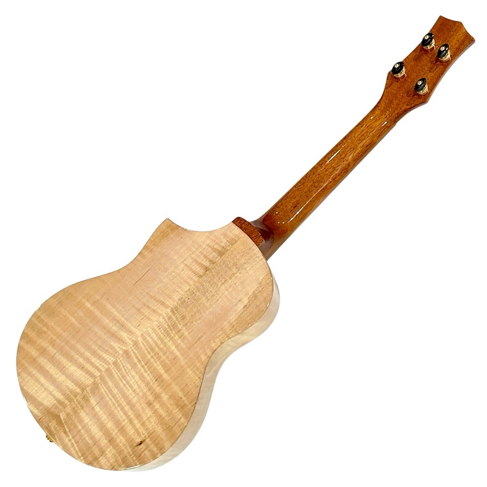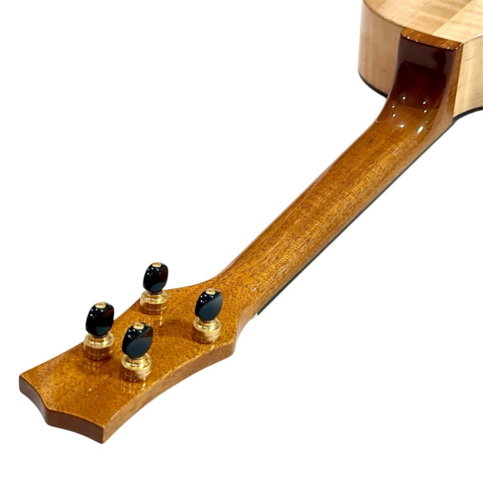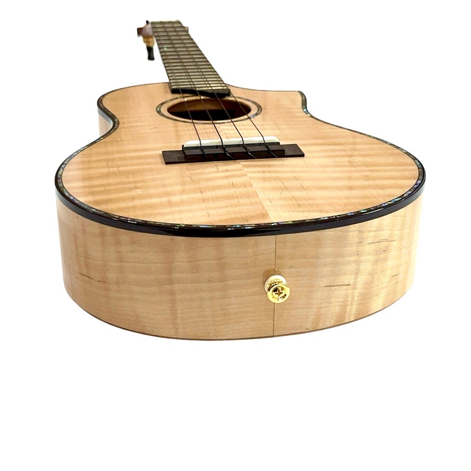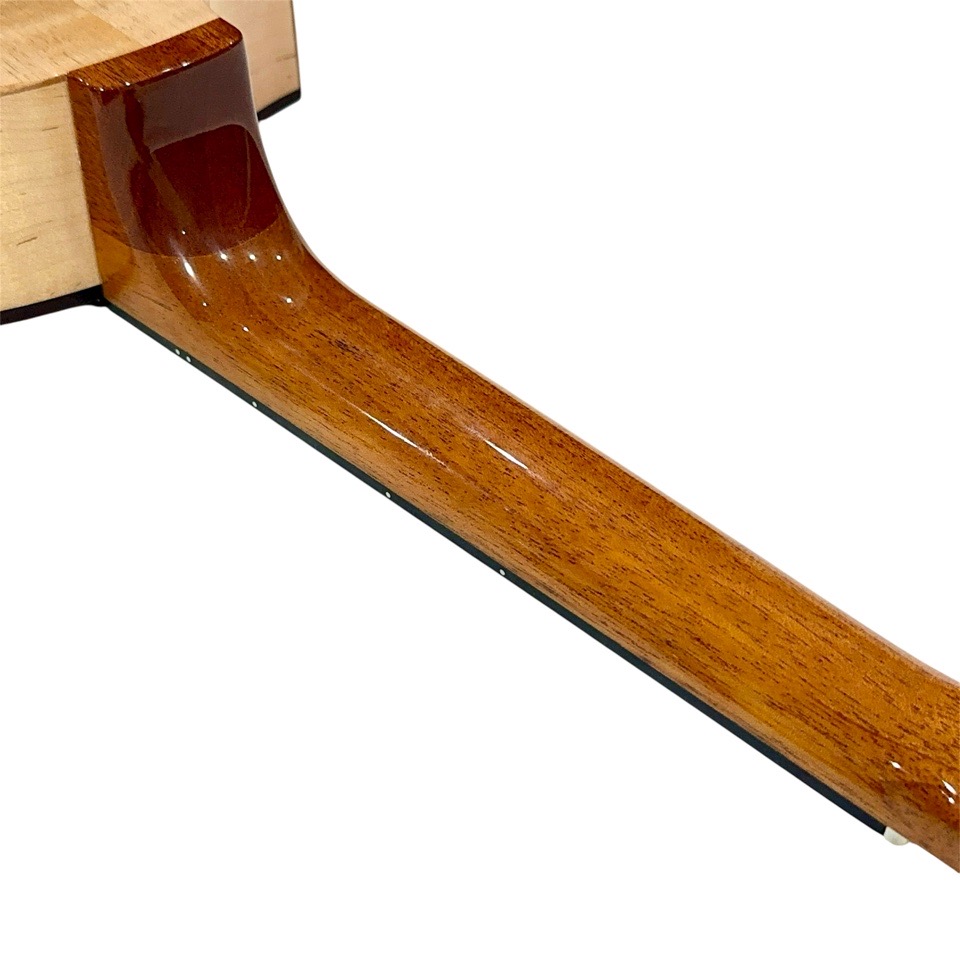 メイプル材は一般的に明るく硬質な音色を持つとされますが、本モデルではテナーのボディサイズで組み合わせることで、音に厚みと包容力が加わり、単なる明るさを超えた非常に深みのあるサウンドに仕上がっています。ひとつひとつの音がきらびやかに立ち上がり、コードを鳴らすと複雑な倍音が豊かに重なり合い、澄んだ響きの中に甘さとコシが共存。ストロークでは輪郭のはっきりしたサウンドが気持ちよく抜け、フィンガーピッキングでは繊細な表現がしっかりと伝わります。