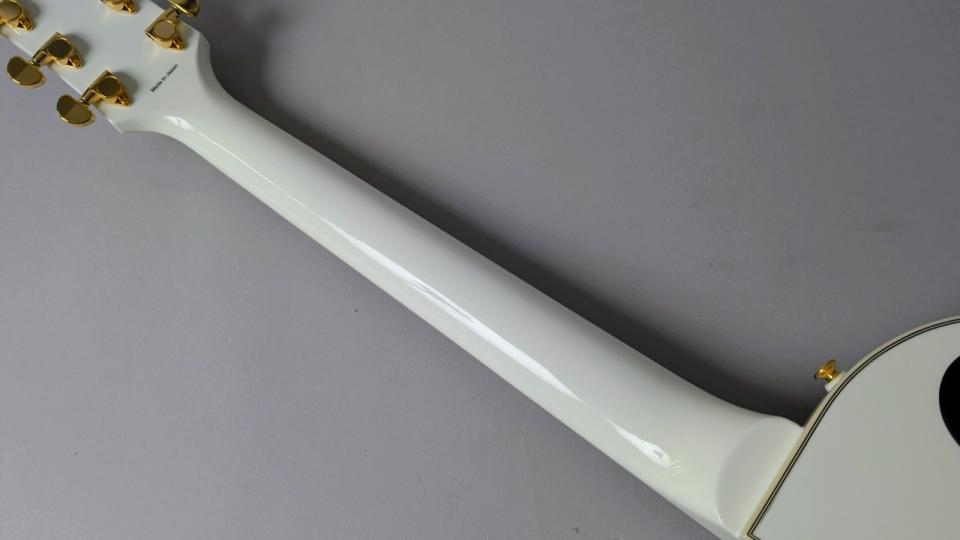 ネックは、程よい太さで握りやすいマホガニー。指板には、硬質でアタック感のあるエボニーが使用され、伝統的なブロックインレイがエレガントさを引き立てます。