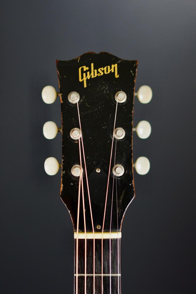 いかにもJ-45らしい黒いヘッドには、GIBSONのシンプルなロゴと黒いトラスロッドカバー。