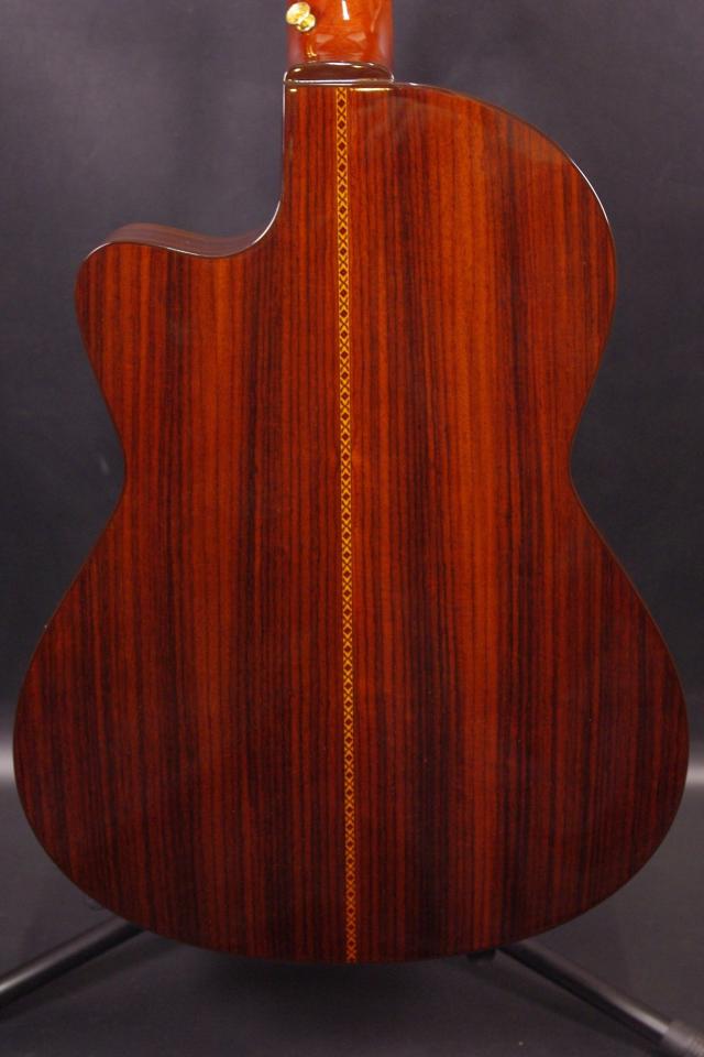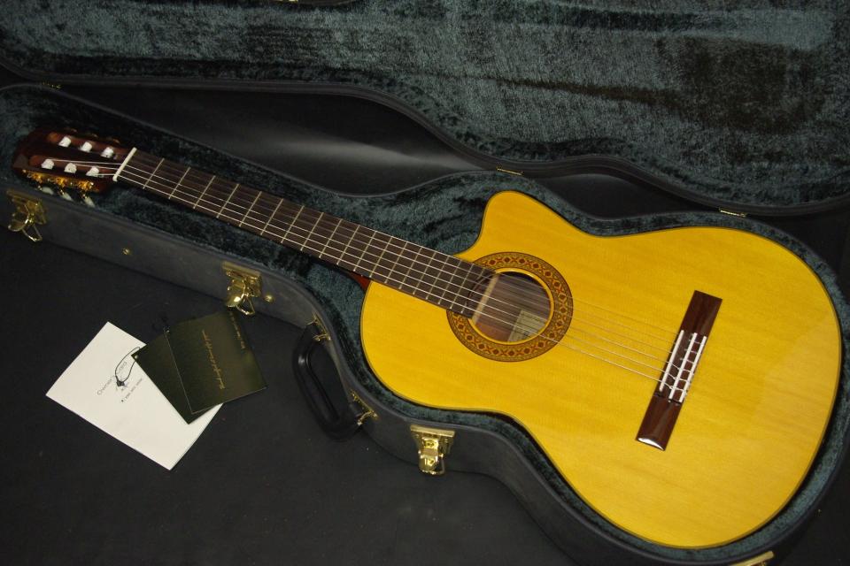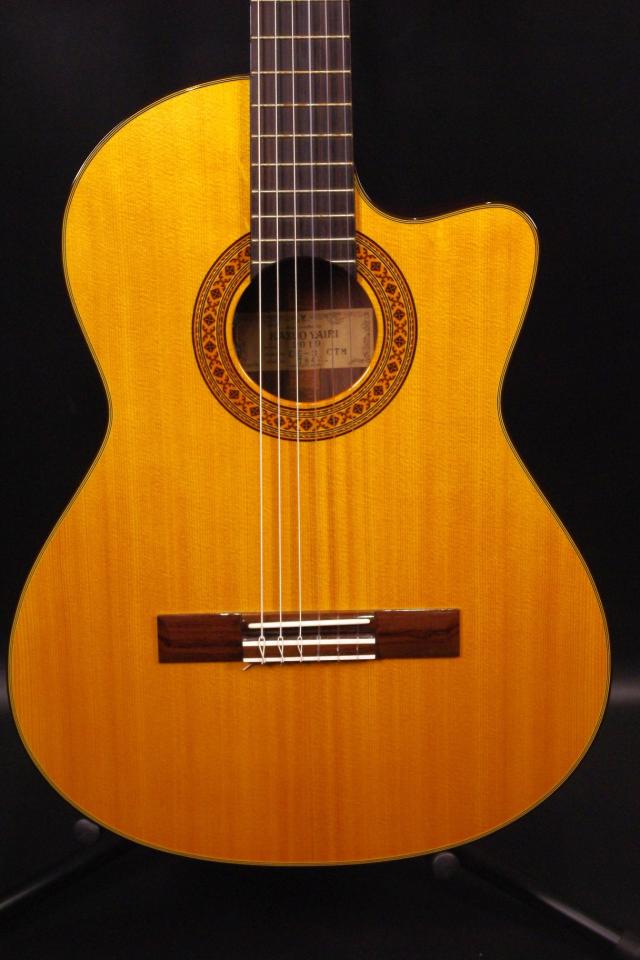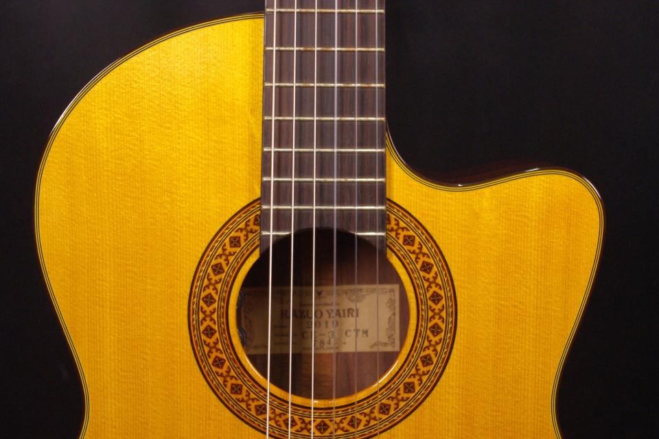 2019年製のK.YAIRI CE-3が美品!極上コンディションで入荷しました!!トップはスプルース単板、サイドバックにはローズウッドを採用、薄いコンパクトなボディにカッタウェイが施された扱いやすいエレガットです!!LRBaggs社のエレメントVTCピックアップが搭載されておりライブでもお楽しみいただけます。2019年製ですが使用感も少なめで大変綺麗に残っています。コンディション、演奏性も優れていますので今後も安心いただけます。ネックヒールへはストラップピンが打っています。ゴールドペグなどパーツもオリジナルです。ナット幅は約46mm、ナイロン弦としてはやや細めでとても握りやすくアコギから持ち替えても違和感なく使えるでしょう!ネックのアングルも理想的でトラスロッドの動作も問題なく機能します。フレット状態もよいです。弦高は12フレット6弦側で約3.4mm、1弦側で約2.7mmの高さで調整してます。お好みに合せた微調整にもお応えいたします。小ぶりなボディサイズですがヴォリュームも十分!反応が素早くはっきりと前に抜けてくれます!!是非この機会にお試しください!お買い得!オリジナルハードケース付!
