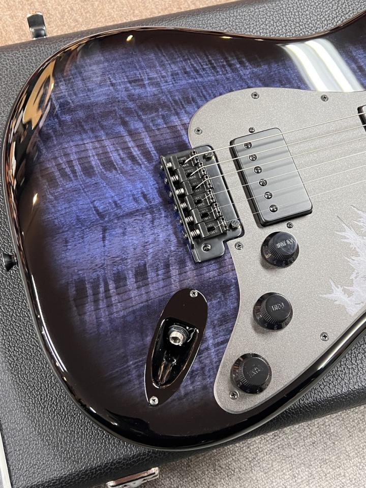アルダーボディにマートルウッドを貼り合わせ、深みのあるブルーで染色しグロスフィニッシュで仕上げることで、ゴジラならではの重厚な存在感を表現。ネックは“Modern C”シェイプで、22フレット仕様のミディアムジャンボフレットを採用し、指板の12フレット付近には、ゴジラのロゴが大胆にあしらわれており、視覚的にも強いインパクトを与えます。