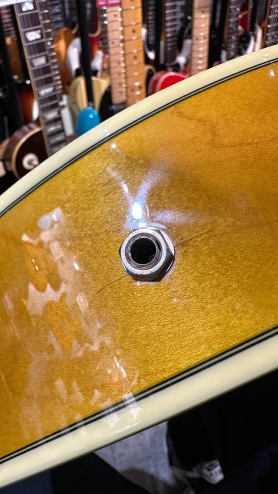 状態といたしましては、金属パーツのくすみ、演奏に伴う弾きキズ、ジャック取り付け位置に軽微なクラックが見られますが外観を大きく損なうようなダメージはございません。現状のプレイアビリティに関して、ネック状態は問題無し、トラスロッドは効き良好左右に余裕あり、フレットに気になる減りは無く9割ほど残っており、外観および演奏面ともに良好なコンディションをキープしております。