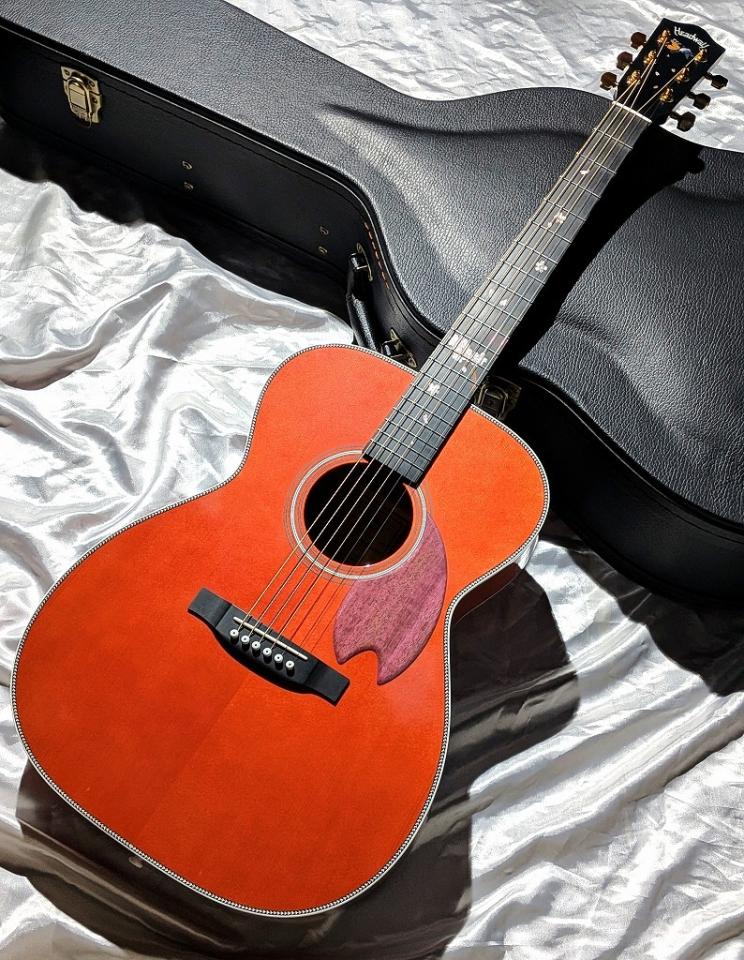 JAPANESE小粋なボディに咲く、満開の桜。煌びやかなパール塗装が彩る、可憐なアコースティック。和の彩りと、洋の風格の出会い。四季の移ろいを閉じ込めた、工芸美の最高峰。