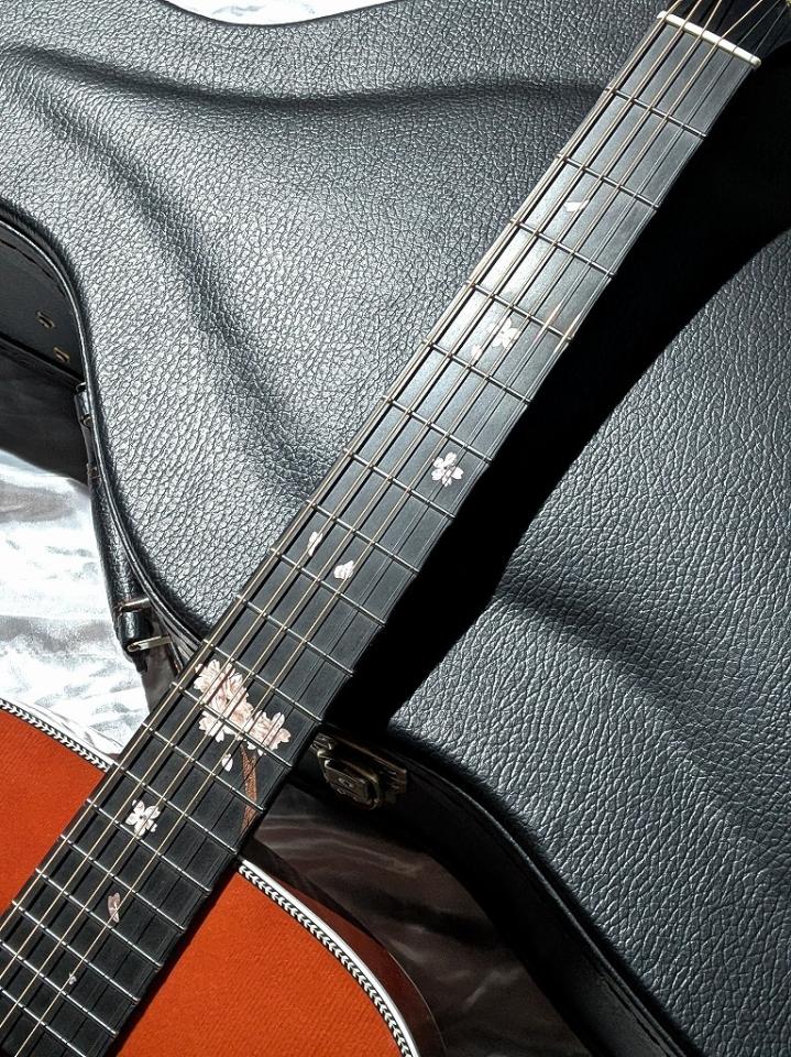 ◆指板インレイ: 桜モデルの象徴の一つとして、指板上にはアクリルと木材を使用して巧みに表現された咲き誇る桜のインレイが美しく施されています。