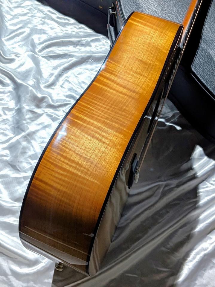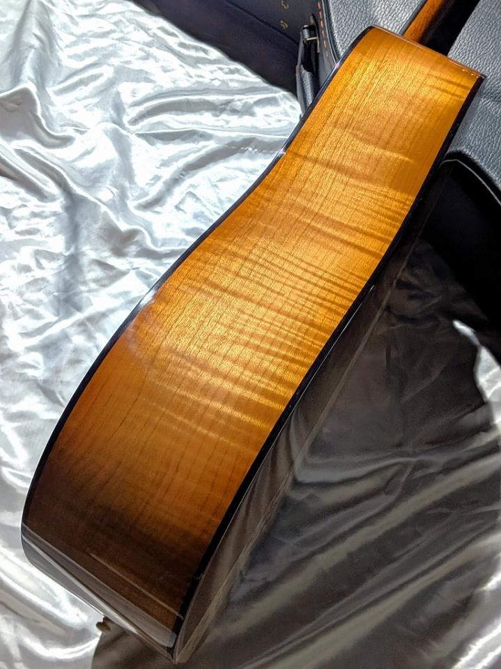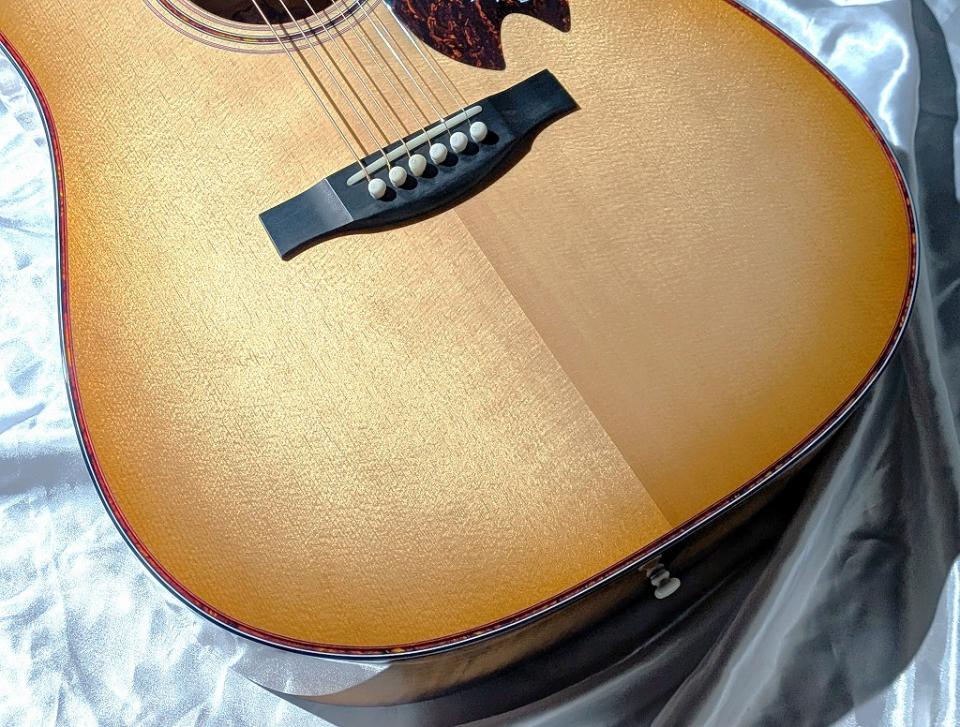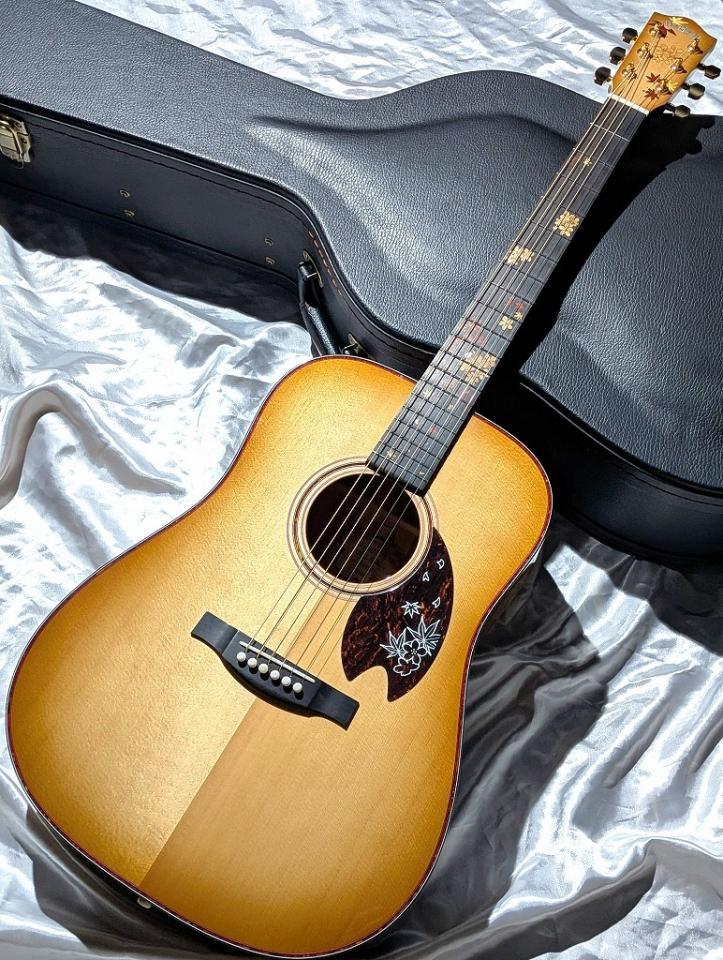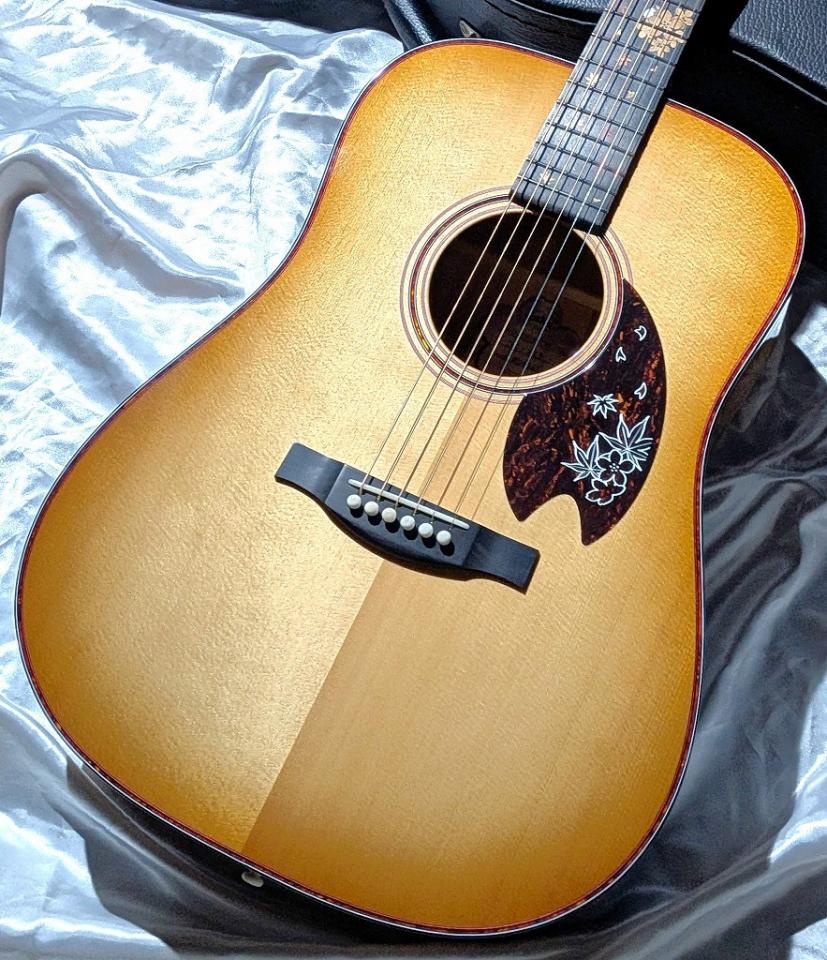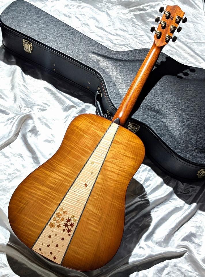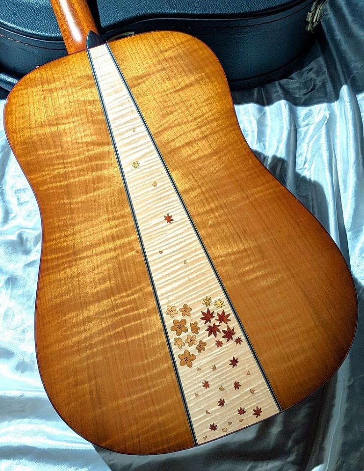 ◆ボディバック: ブラウンのバーストと楓材のセンターピースが、ドレッドノートの大きなボディで見事に調和。奥行きのある楓材に、桜と紅葉が両脇に広がる幻想的な景色を描写しています。