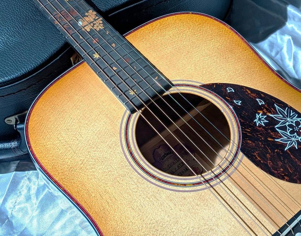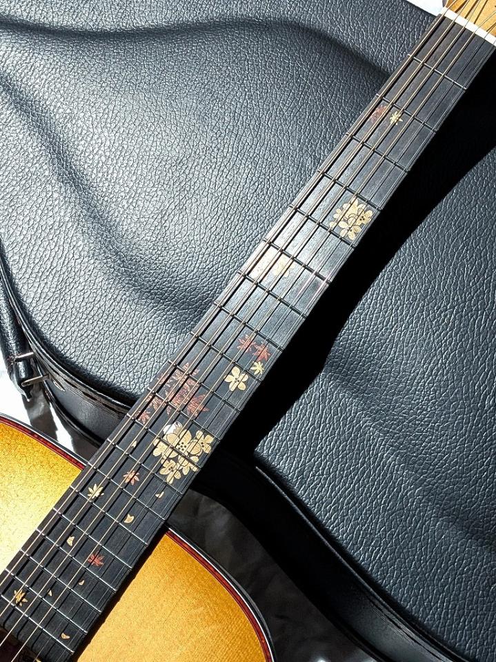 桜と紅葉が両脇に広がる情景を見事に描写し、ピックガードやサウンドホールカバーにも、