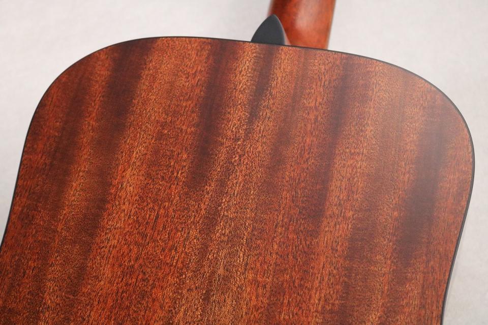 トリファイド・スプルースによるヴィンテージライクな鳴りに加え、ドレッドノートシェイプによる低音の響きと相まって弾きごたえ抜群のサウンドとなっております。また、サイド&バックのマホガニーを採用しているため、弾く力の強弱次第で繊細なサウンドから少し歪んだようなラウドなサウンドまで幅広い表現ができるのも特徴となっております。