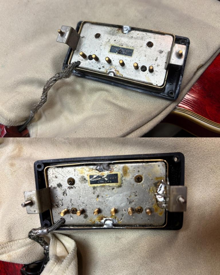 ・ピックアップ:ポッティング処理が施されており、シールド線の補修と継ぎ足し、リアピックアップシャーシの補強跡なども確認できるためオリジナル度は高くない状態