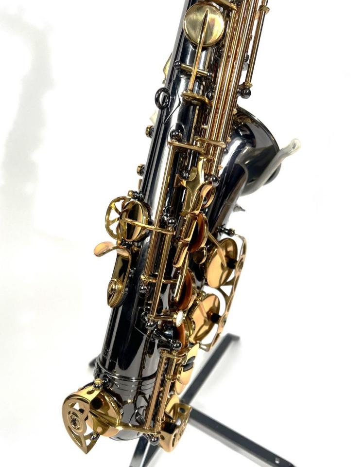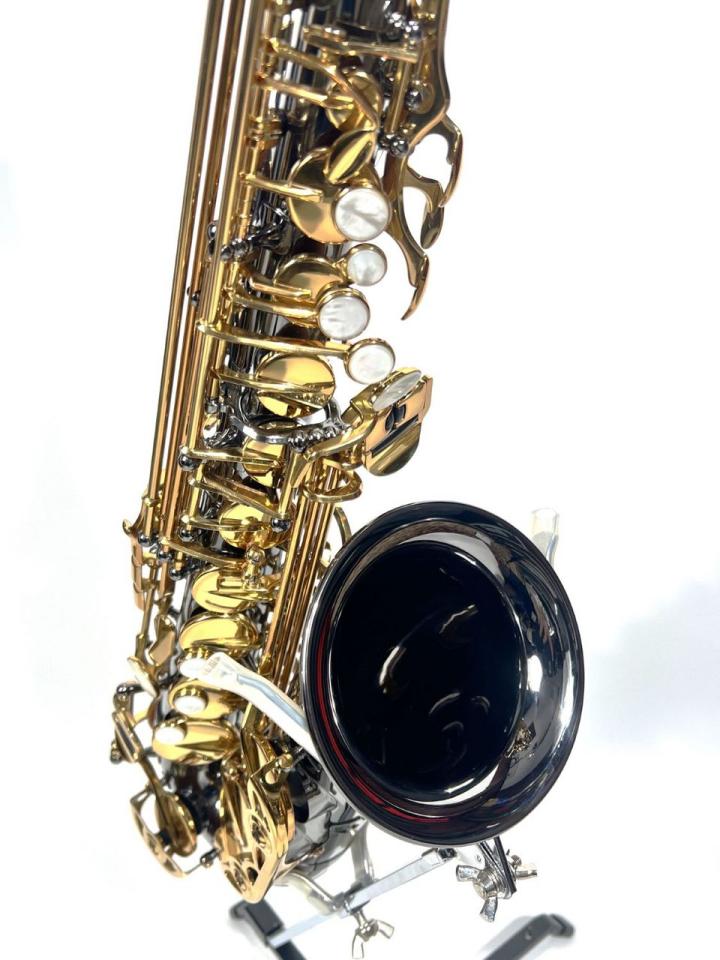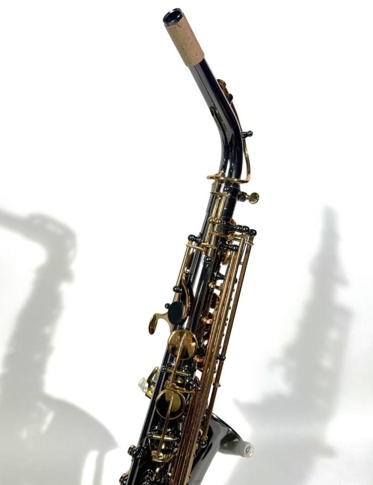 FORESTONEアルトサックスGXシリーズの中古品の整備が完了しました。管体はブラックニッケルメッキ仕上げ、キイ、キイポストはクリアラッカー仕上げでツートーンカラーが映えます。