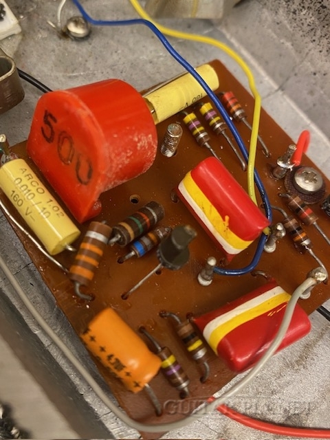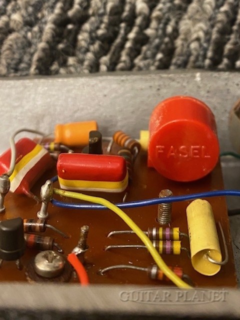 1960年代中頃から末にかけてVoxやThomas OrganのエフェクターはイタリアのEME(Electonica Musicale Europea)により製造されましたが、その後1960年代末頃に創業したイタリア、ペスカラのJEN ELECTRONICAが製造を引き継ぎました。そして本機は各パーツなどから、その時期のに個体だと思われます。インダクターには赤色FASELが採用されています。