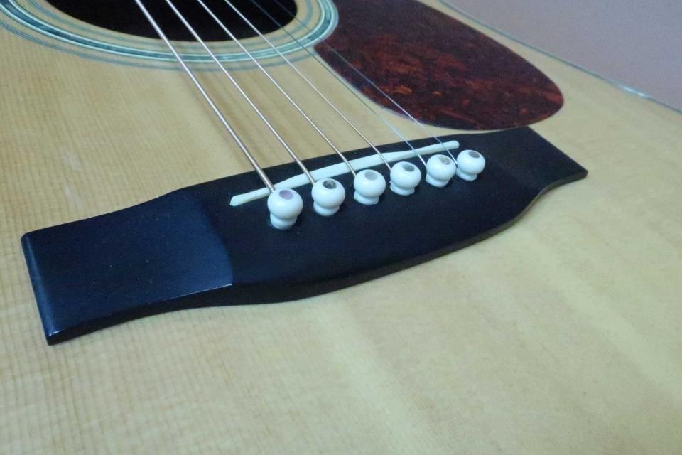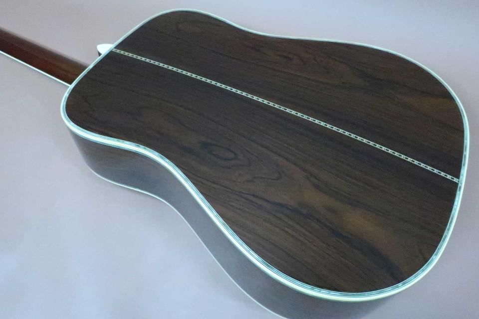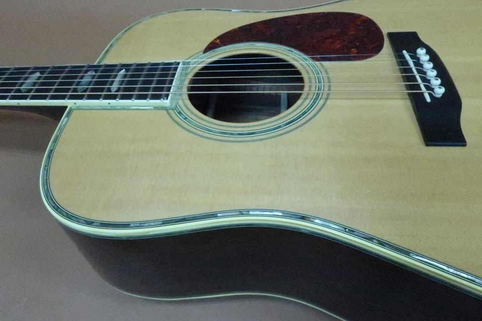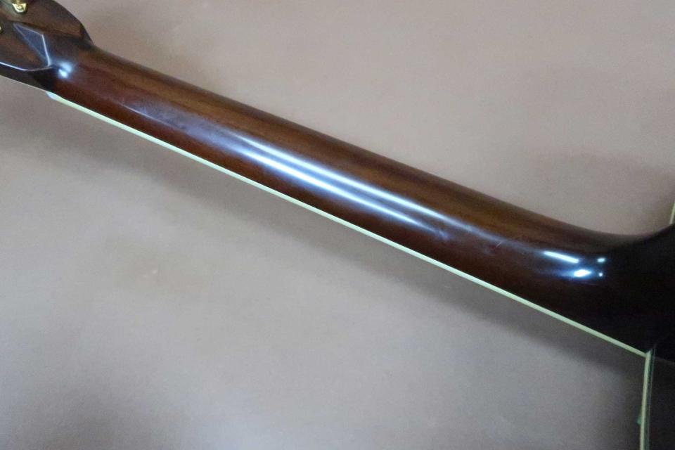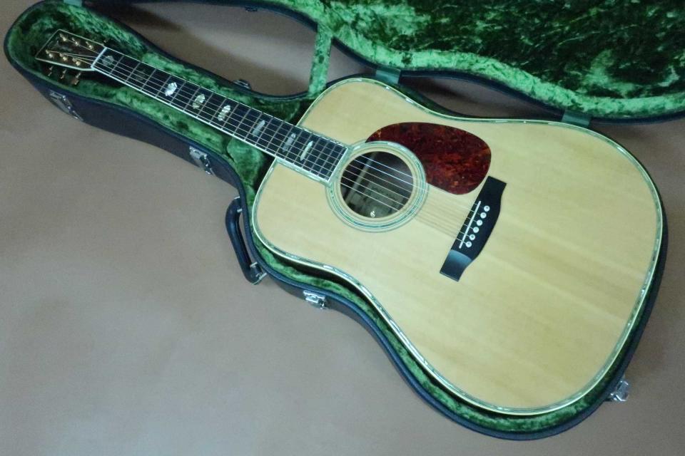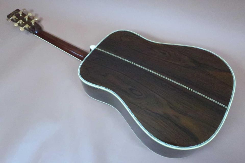 状態は生産から25年以上経過したギターですが、使用感も少なくペグの金属劣化も殆ど見受けられず輝いており、トップの日焼けも少なくピックガードのスクラッチ傷も殆ど見受けられず新品同様のコンディションを保っており、サイド&バックも目立つ様な傷や打コンも見受けられず、フレットも殆ど減っておらずネック裏もとても綺麗で演奏性も問題ありません。見る限りオールオリジナル・コンディションを保った極上品です。またネックヒールのピン打やピックアップの取り付け履歴もありません。。弦長約650mm、ナット幅約43mm、弦高も12F6弦で約2.3mm、1弦約2mm、サドルも若干余裕が見られありトラスロッドも効いており余裕も見られ反りや元起も問題が無くネックを含めプレイヤビリティも良好です。オリジナル・マーティンオールドレプリカ・ハードケースも付属しています。中古市場でも滅多に出ない初期のD-45スタイルのハカランダ仕様です。新品同様のコレクタブルな極上コンディションを保ったお勧め品です。是非この機会にご検討を頂ければ幸いです。