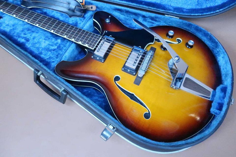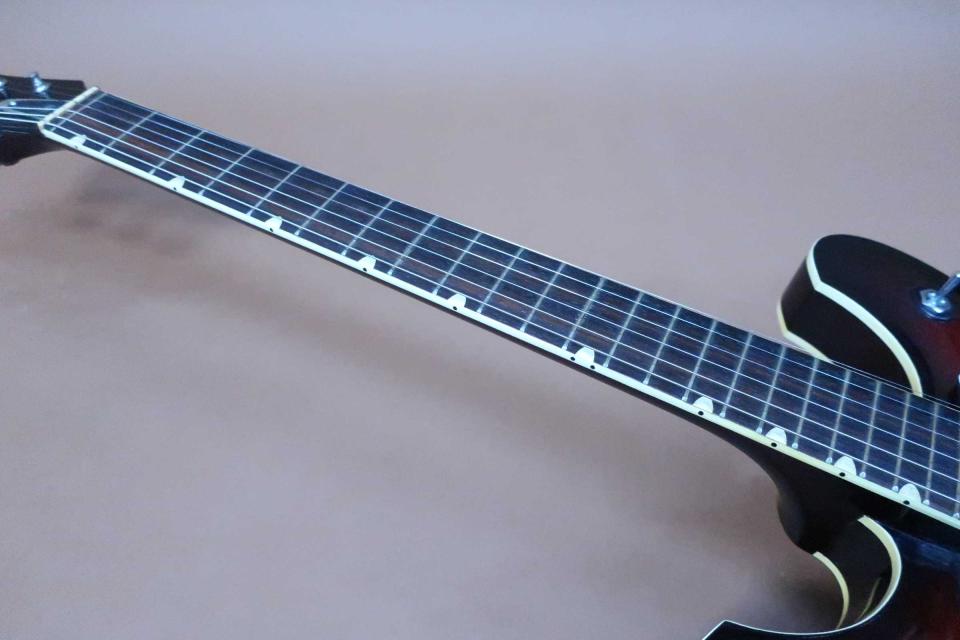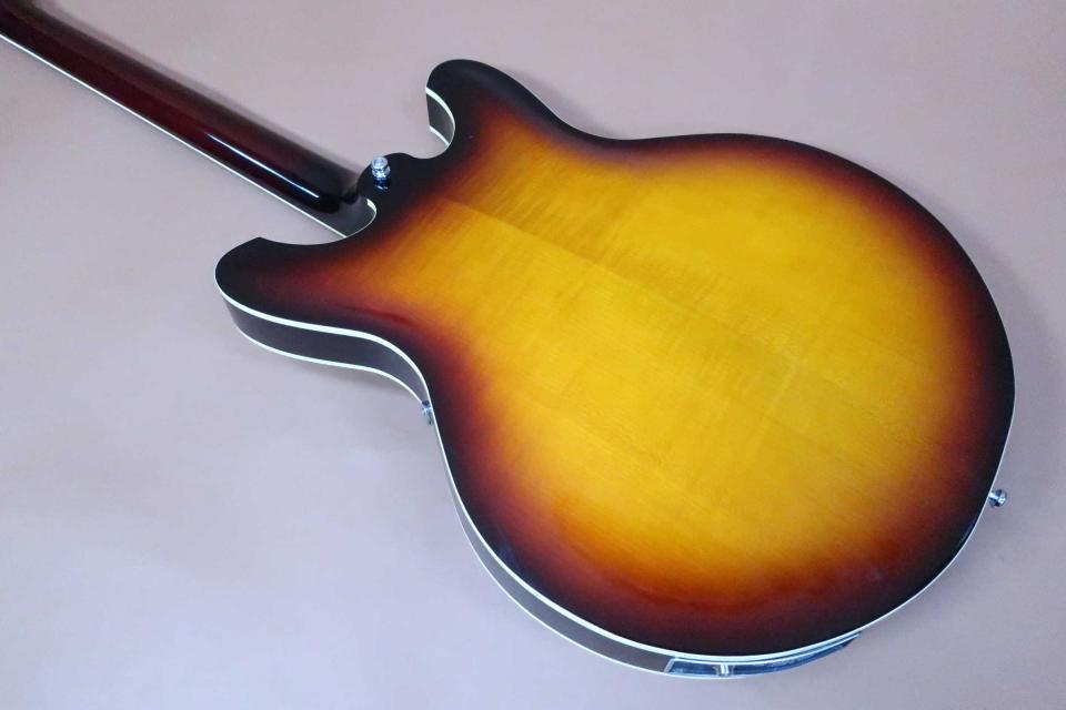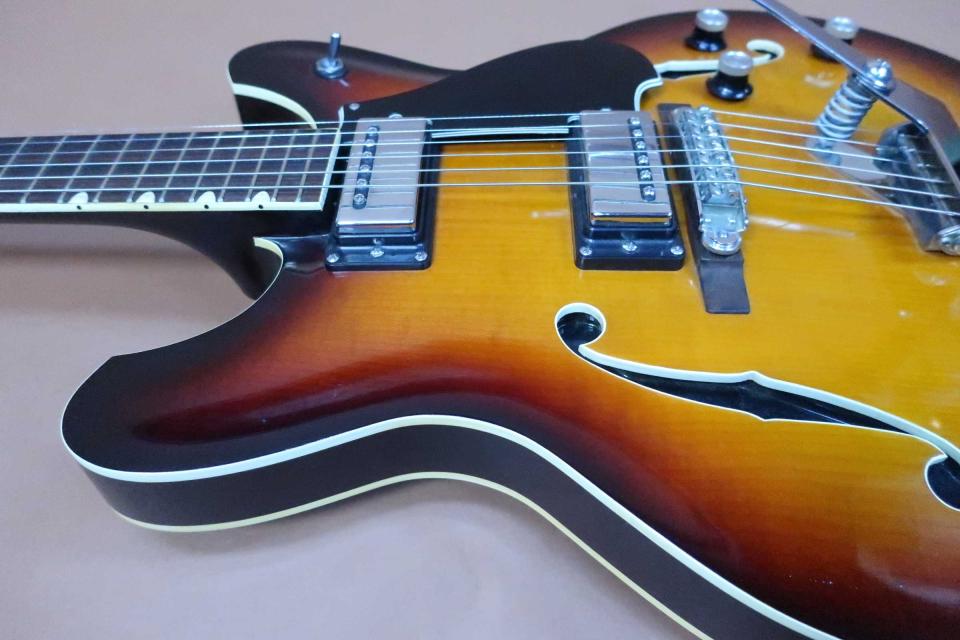 サウンドは良い感じで優しく包み込むようなフロント・サウンドからリアの少しエッジの効いたキレの良い鳴りも魅力です。アンプを通さなくても心地良くボディーなりして楽しめるセミアコです。