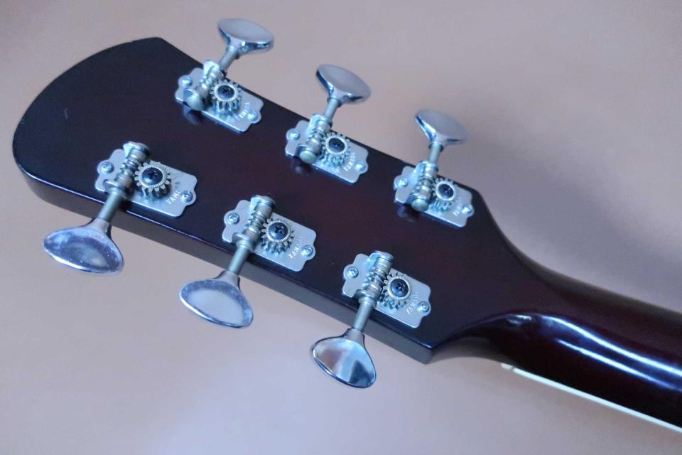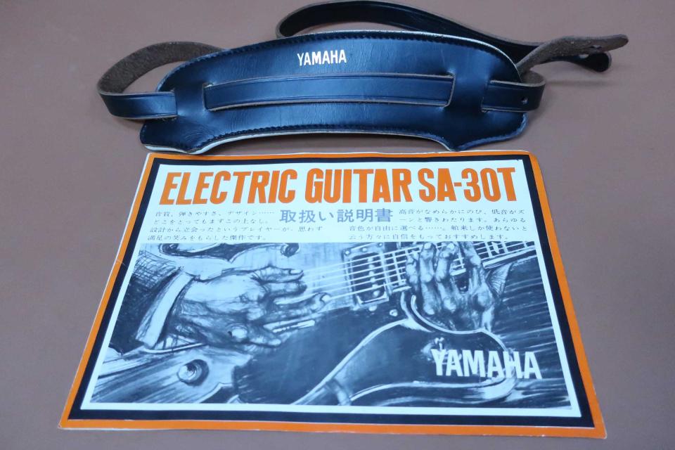 希少なジャパン・ヴィンテージのセミアコ・モデル、YAMAHA SA-35Tの入荷です。本器は指板エンドのシリアル NOや1968年頃のカタログから1972年頃のモデルだと思います。ボディーやネックはメイプル材が使用されトップやバックのアーチも美しい逸品です。ヘッドにはオリジナル・オープンバック・ペグ、0-フレット、メイプル・セットネック、アジャスタブルロッド、オリジナル・ポジションマーク、特許出願中のローノイズ・ピックアップ、可変式&ローラーコロ・ブリッジ、トレモロユニット、当時のハウリング防止のため、f-フォールには厚めのフィルムが内側から貼られており、当時としては画期的なモデルだと思います。ザ・タイガースのギタリスト 森本氏はワンランク上位のSA-50アンガーグリーンを所有されていました。
