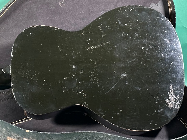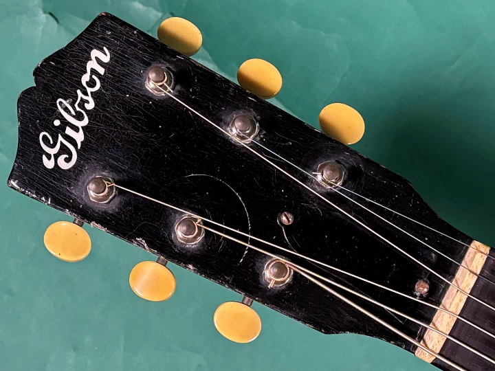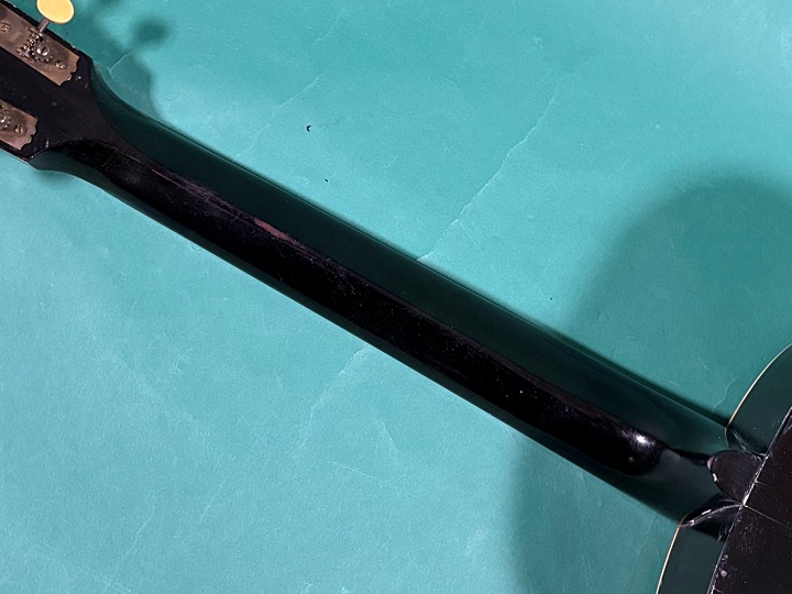 今回の楽器はファクトリーオーダーナンバーのみでシリアル番号が無いため、正確な年代は特定出来ませんが、太い三角ネックですので、1936年から38年だと思われます。