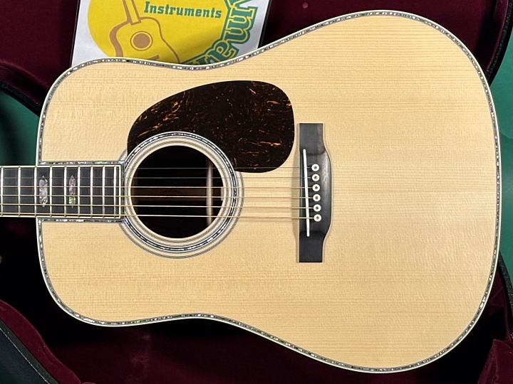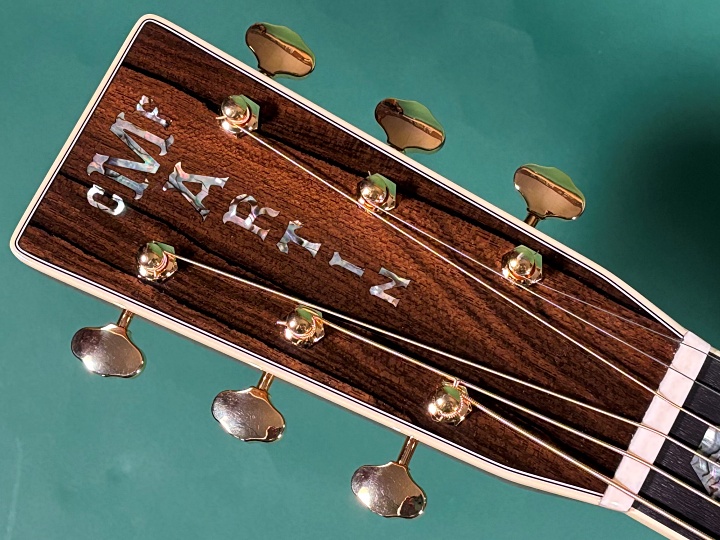 新品ながら、豊かな低音弦の倍音と艶やかで伸びやかな高音弦の響き、ストローク時のクリアで華やかな鳴りとバランスとの良さは、まさにD-45の名にふさわしいサウンドです。もちろん、新しい楽器ですので、弾き込むことでさらにこなれ、将来的により深みのあるサウンドへと育っていくと思われます。
